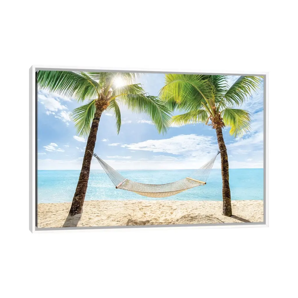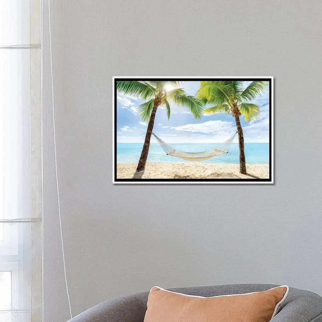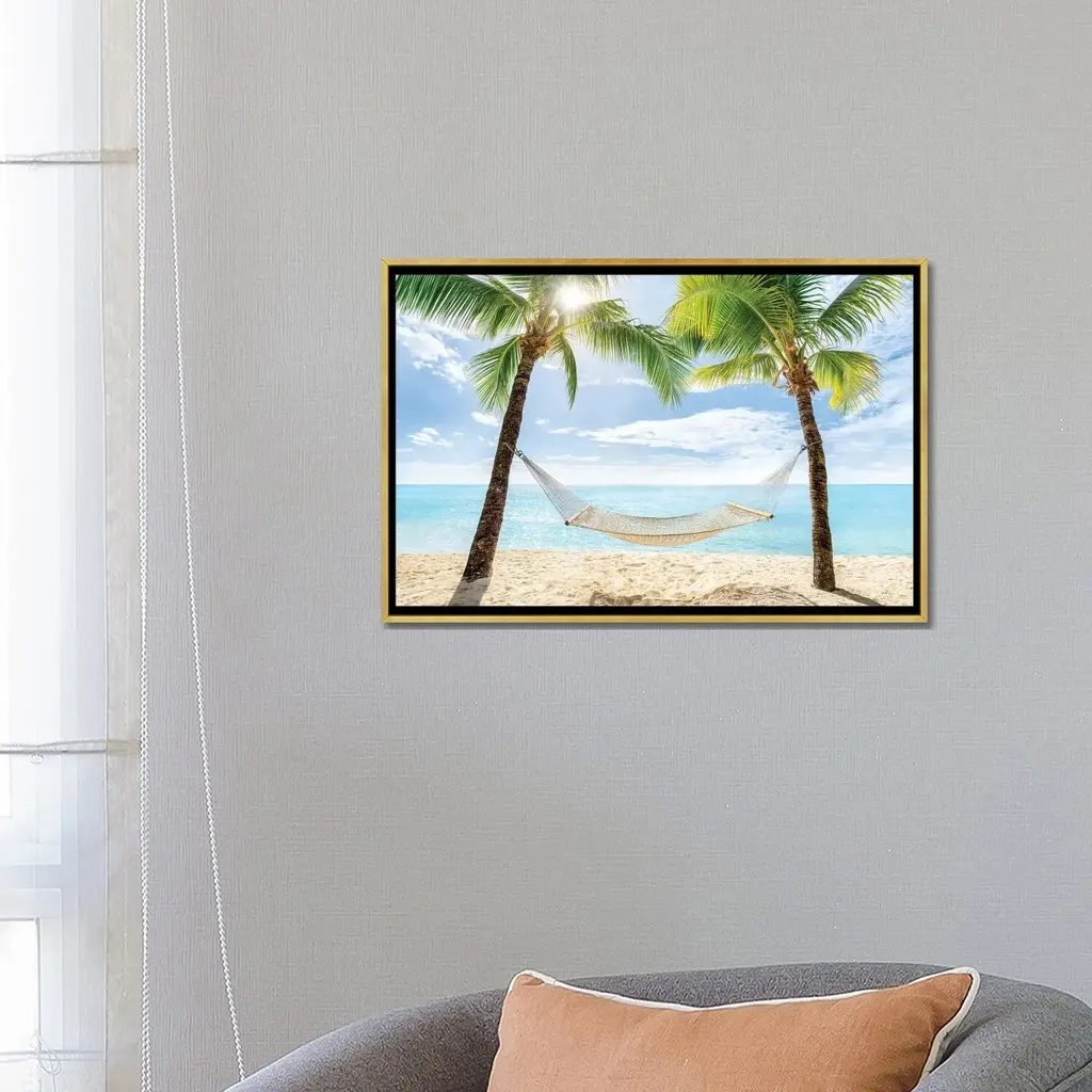 Add a touch of relaxation to your space with the iCanvas "Relaxing Summer Vacation In A Hammock" Framed Canvas Print by Jan Becke. Created with the texture and feel of fine-art paintings, this Giclee canvas artwork is a great alternative to thin posters and paper prints. Expertly crafted in the USA, this print features artist-grade canvas that is professionally hand-stretched and stapled over North American pine-wood bars in Gallery Wrap style. The 2-inch thick elegant hardwood frame adds a sophisticated touch, while the inset art creates a "floating" illusion. With fade-resistant archival inks, the vibrant colors will remain perfect for decades, even in strong light. Enhance your space with this contemporary and detailed piece of art.Features: