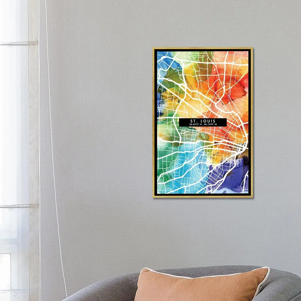 Icanvas "Saint Louis City Map Colorful Watercolor Style" By Walldecoraddict Framed Canvas Print - Black - 26x18