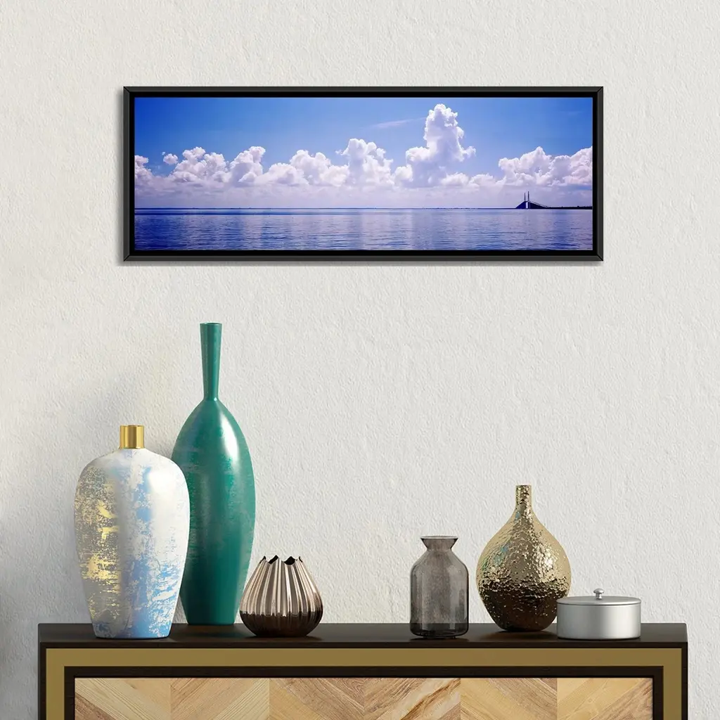 Icanvas "Seascape With A Suspension Bridge In The Background, Sunshine Skyway Bridge" By Panoramic Images Framed Canvas Print - 12x36 - Black