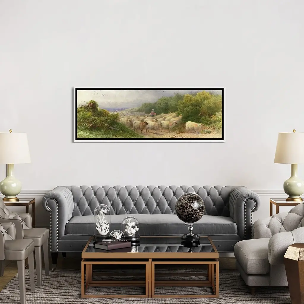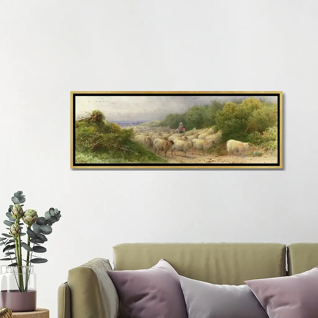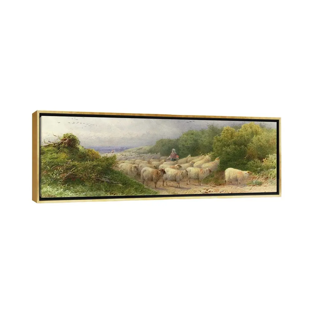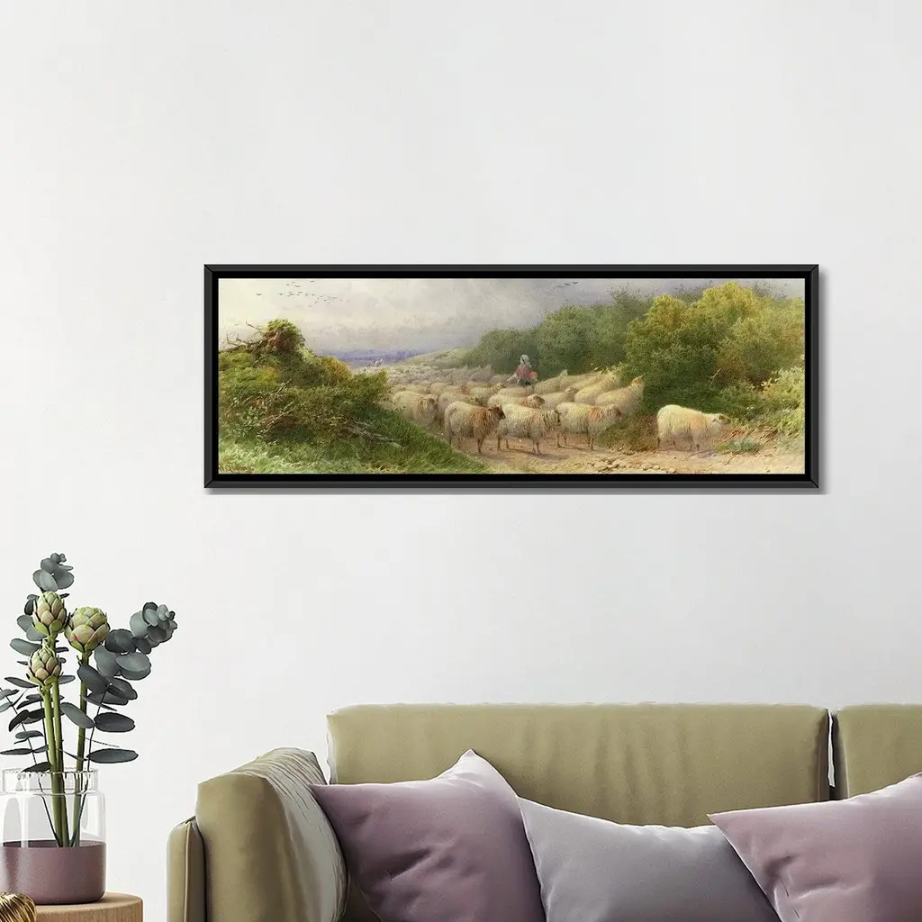 Icanvas "Sheep On The Downs " By William W. Gosling Framed Canvas Print - Black - 20x60