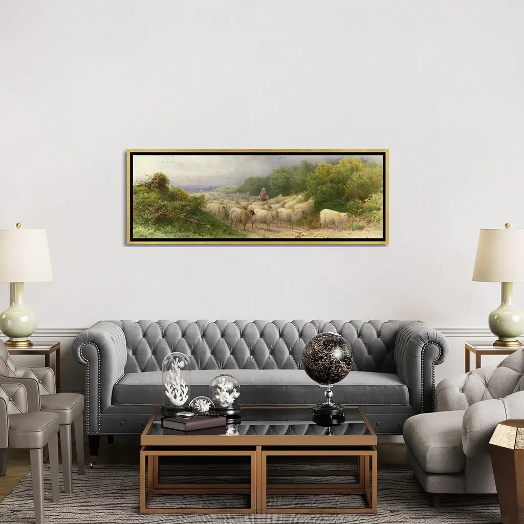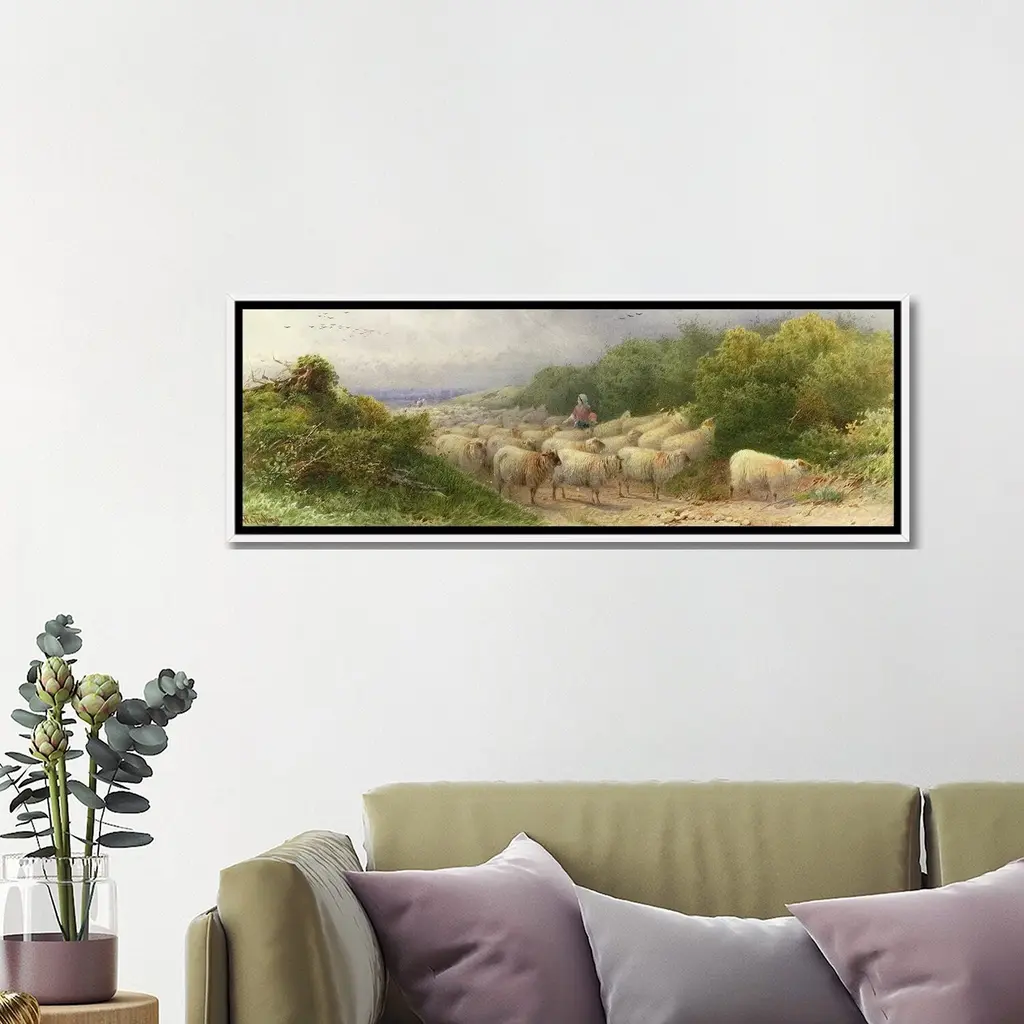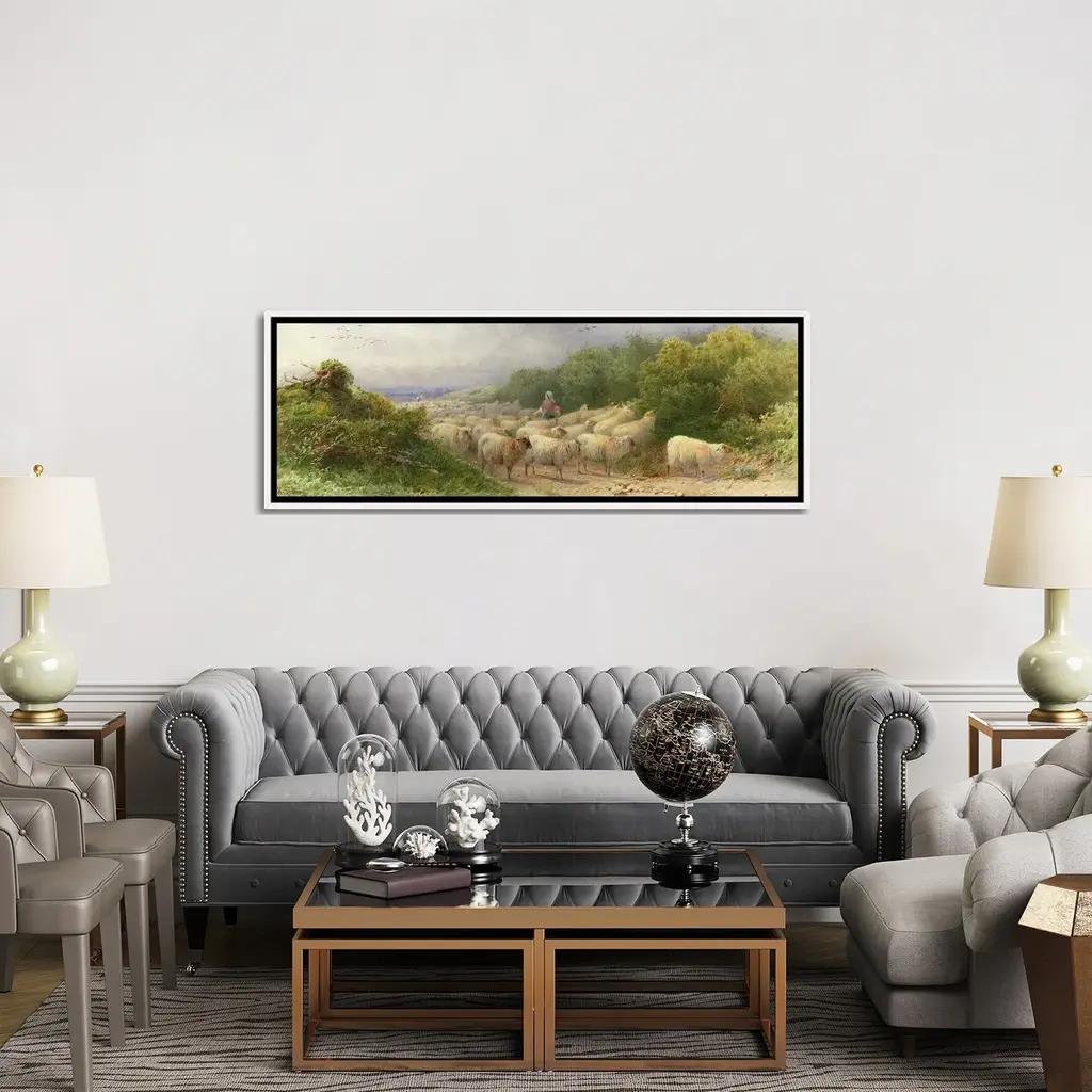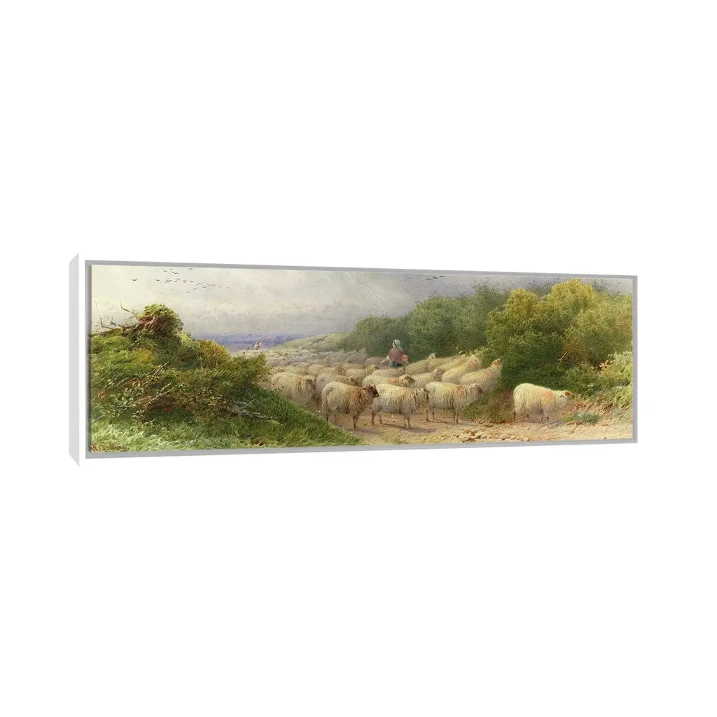Icanvas "Sheep On The Downs " By William W. Gosling Framed Canvas Print - White - 16x48