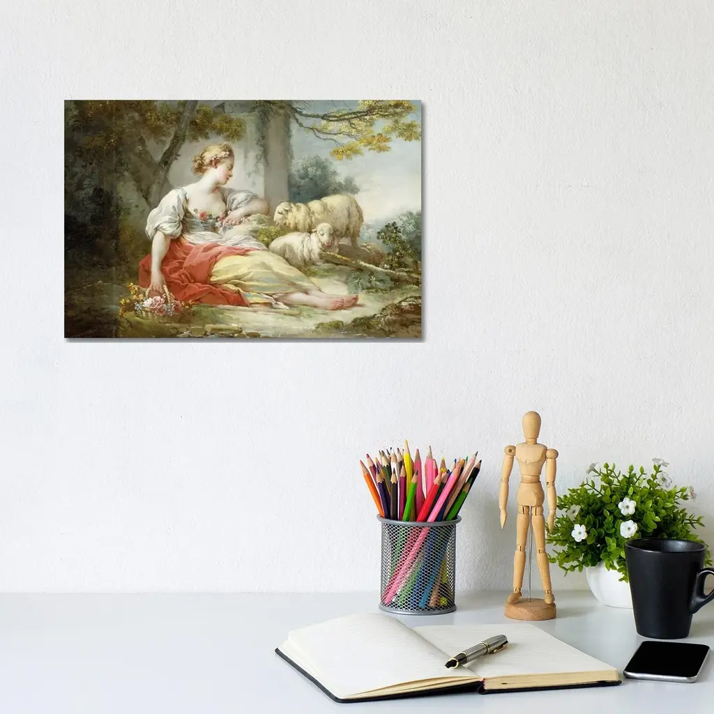 Icanvas "Shepherdess With Sheep And A Basket Of Flowers Near A Ruin In A Wooded Landscape" By Jean-Honore Fragonard Canvas Print - 32x48x1.5