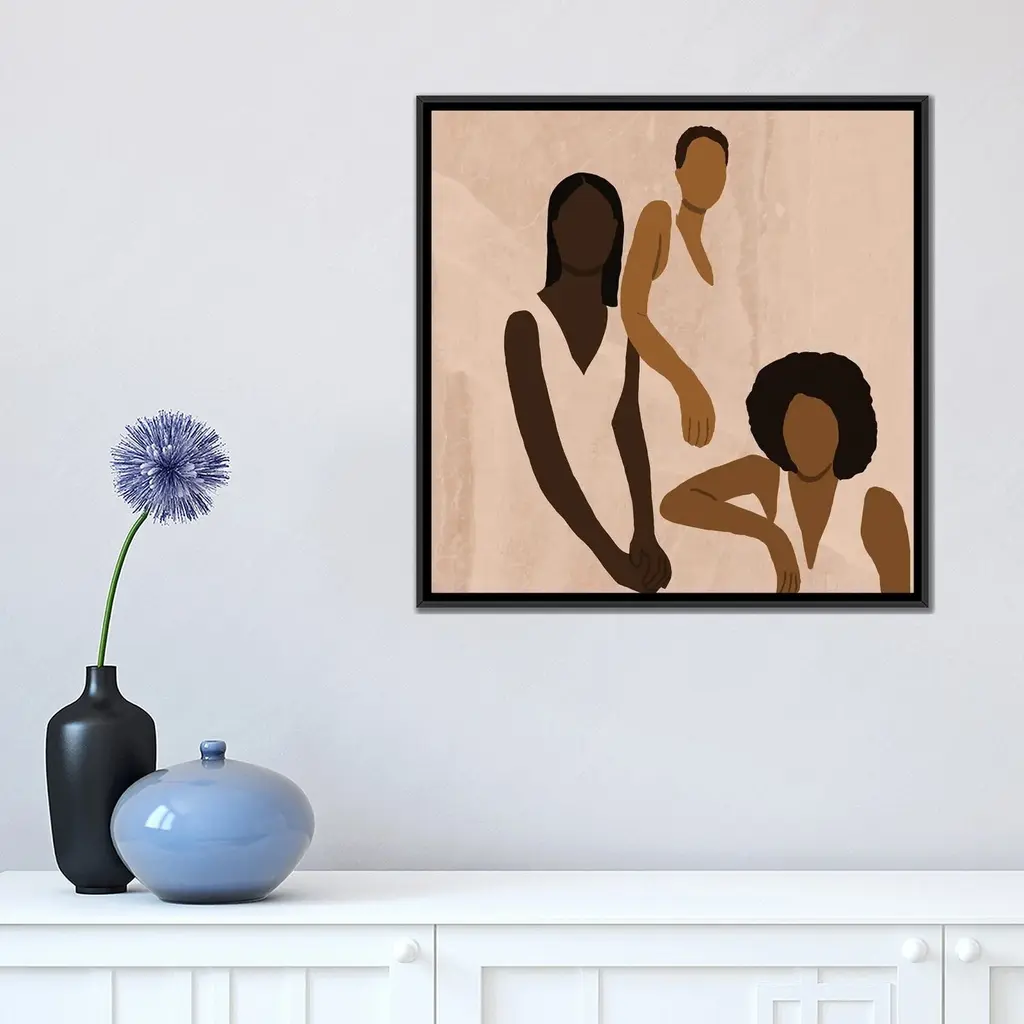 Add a touch of elegance and sophistication to your space with the iCanvas "Stronger Together" by Sarah Dahir Framed artwork. Crafted in the USA with artist-grade canvas, this giclee canvas artwork offers the texture, look, and feel of fine-art paintings. The gallery-wrap style, with professionally hand-stretched and stapled North American pine-wood bars, ensures a high-quality presentation that is commonly seen in art galleries. The artwork is mounted to a 2-inch thick hard wood frame, creating a "floating" illusion with a 3/8" space between the art and frame. With fade-resistant archival inks, the colors will remain vibrant for decades even when exposed to strong light. Experience contemporary style and exceptional detail with this stunning piece.Features: