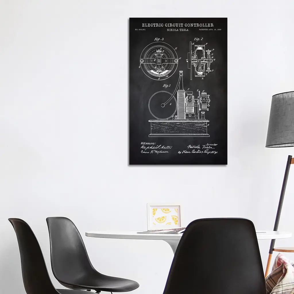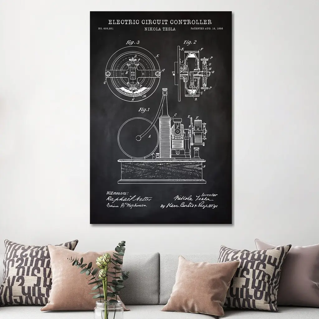 Icanvas "Tesla Electric Circuit Controller, Black" By Patentprintstore Canvas Print - 48x32x1.5