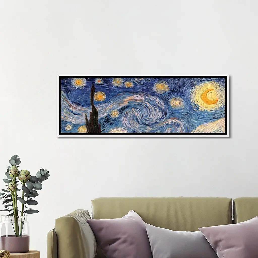 Icanvas "The Starry Night" By Vincent Van Gogh Framed Canvas Print - 16x48 - White