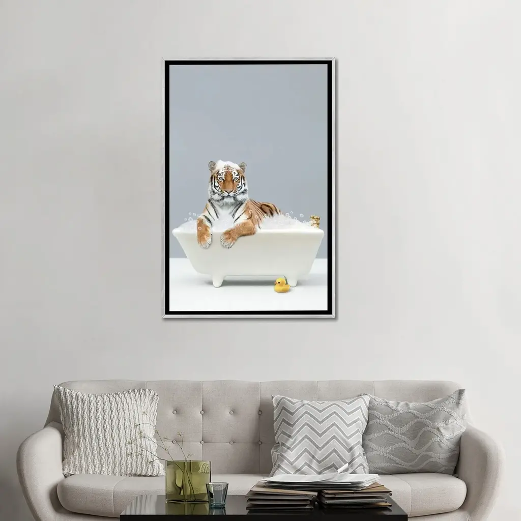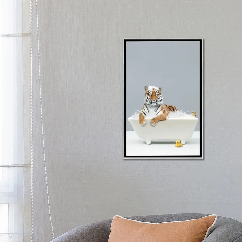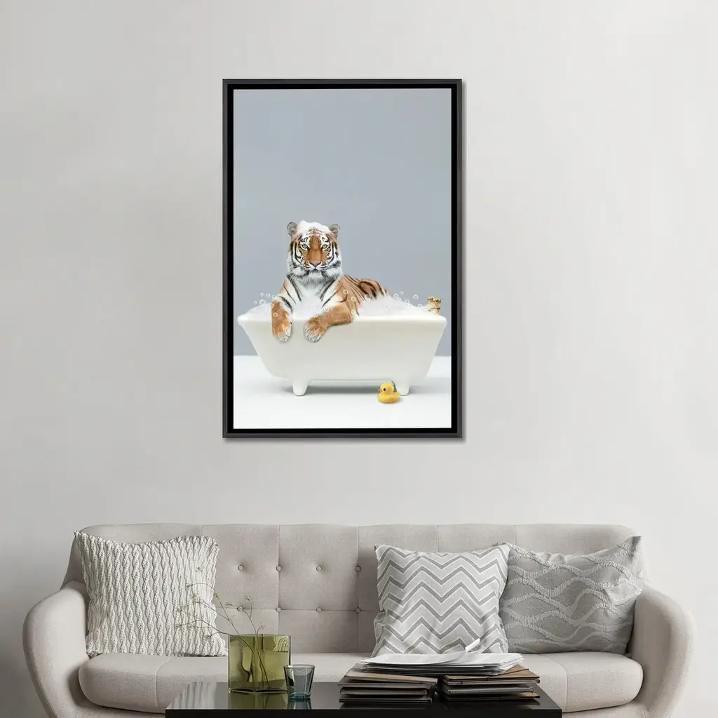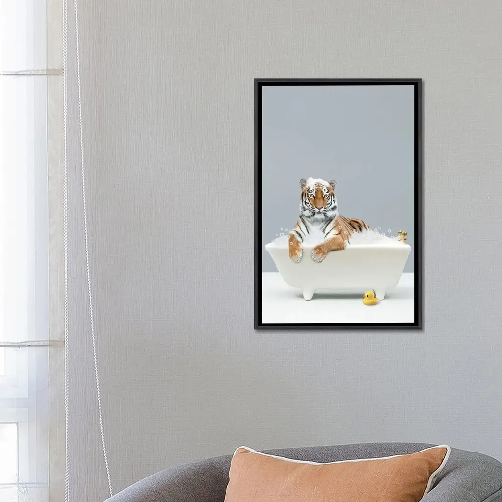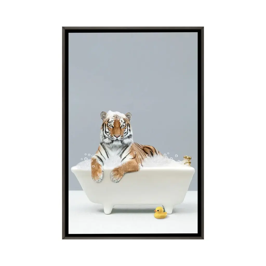 Icanvas "Tiger In A Bathtub" By Tiny Treasure Prints Framed - Ebony - 48x32