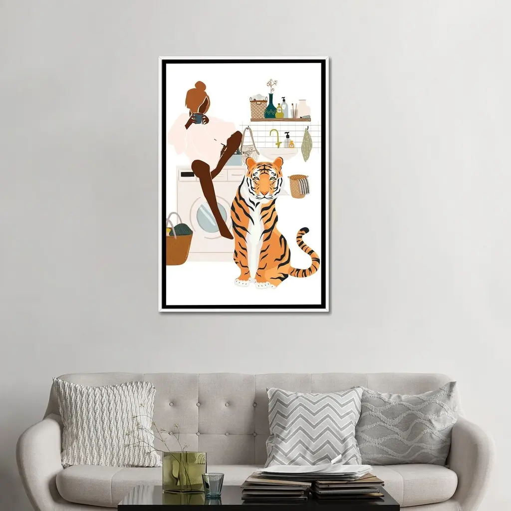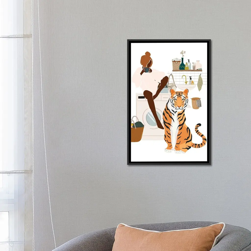 Icanvas "Tiger In Laundry Room" By Jania Sharipzhanova Framed Canvas Print - Gold - 48x32