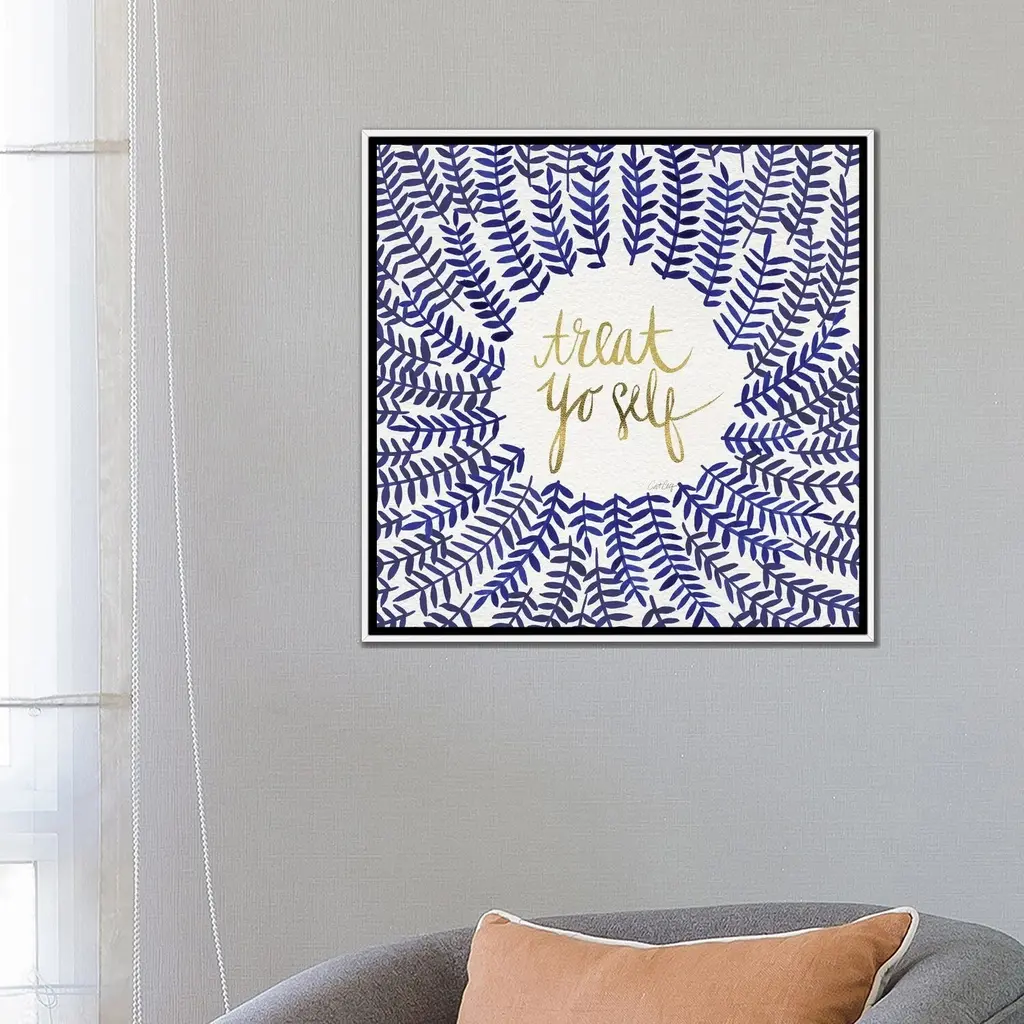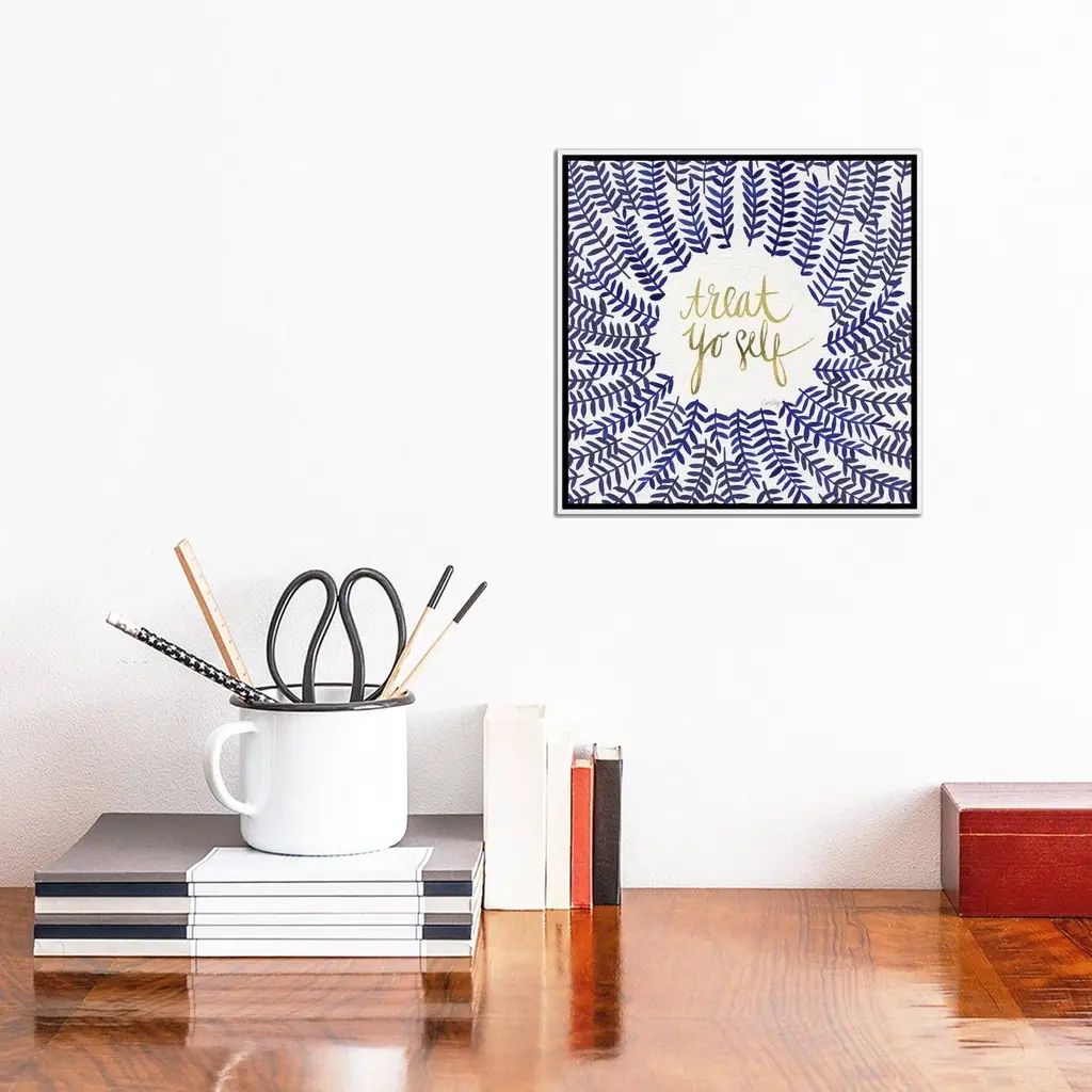 Elevate your space with the iCanvas "Treat Yo Self, Navy" Framed Canvas Print by Cat Coquillette. This high-quality artwork is printed on artist-grade canvas, giving it the texture and feel of a fine-art painting. Crafted in the USA, the canvas is professionally hand-stretched and stapled over pine-wood bars in Gallery Wrap style, a technique used by artists. The print comes mounted to a 2-inch thick hardwood frame, creating a sleek "floating" illusion. With fade-resistant archival inks, the vibrant colors will remain perfect for decades, even in strong light. Bring contemporary style and exceptional detail to your home with this eye-catching piece.Features: