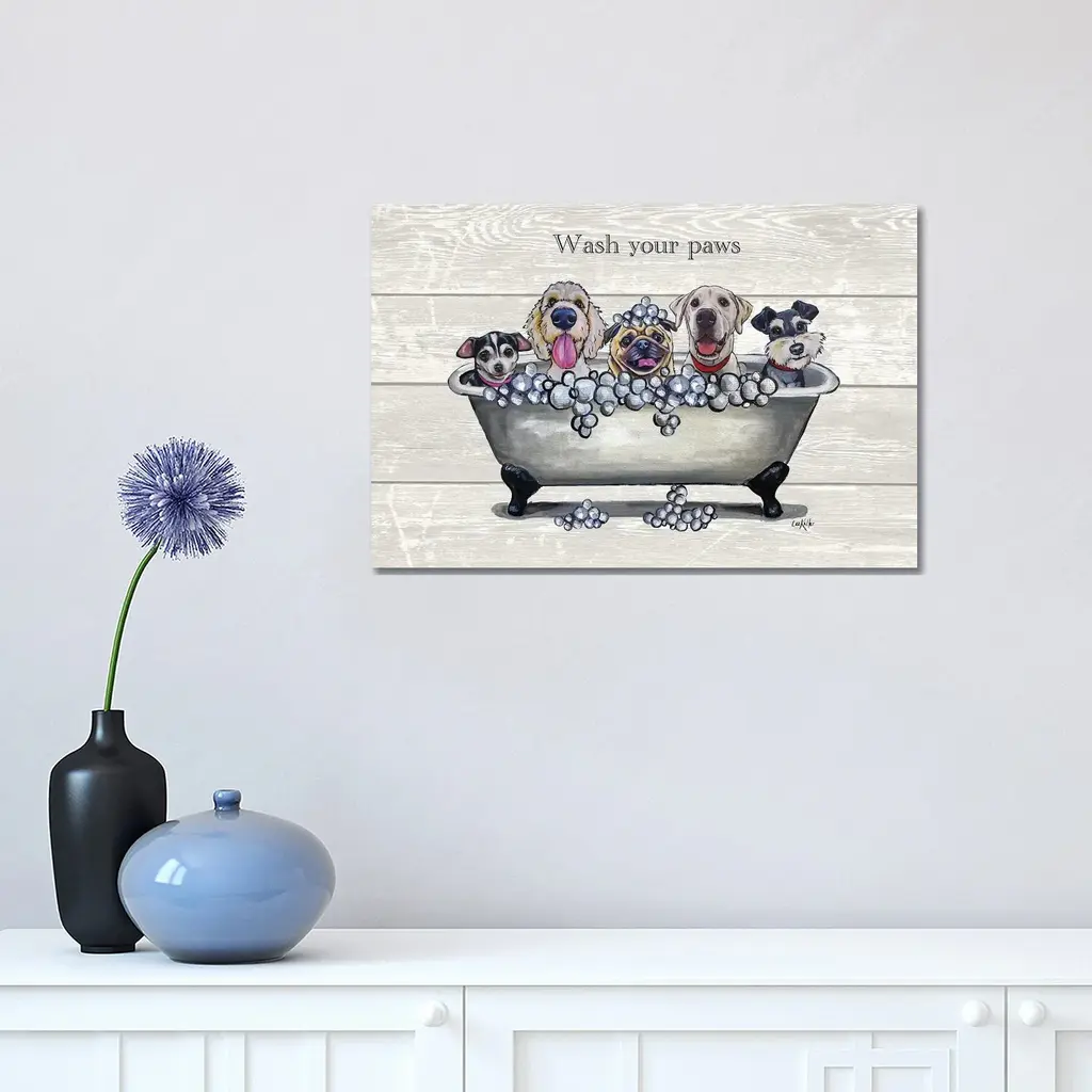 Icanvas "Tub With Dogs, Bathroom Dogs, Wash Your Paws" By Hippie Hound Studios Canvas Print - 18x26x1.5