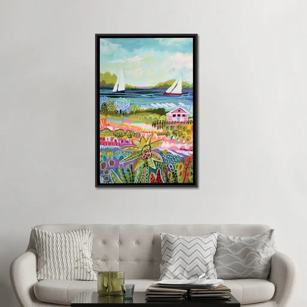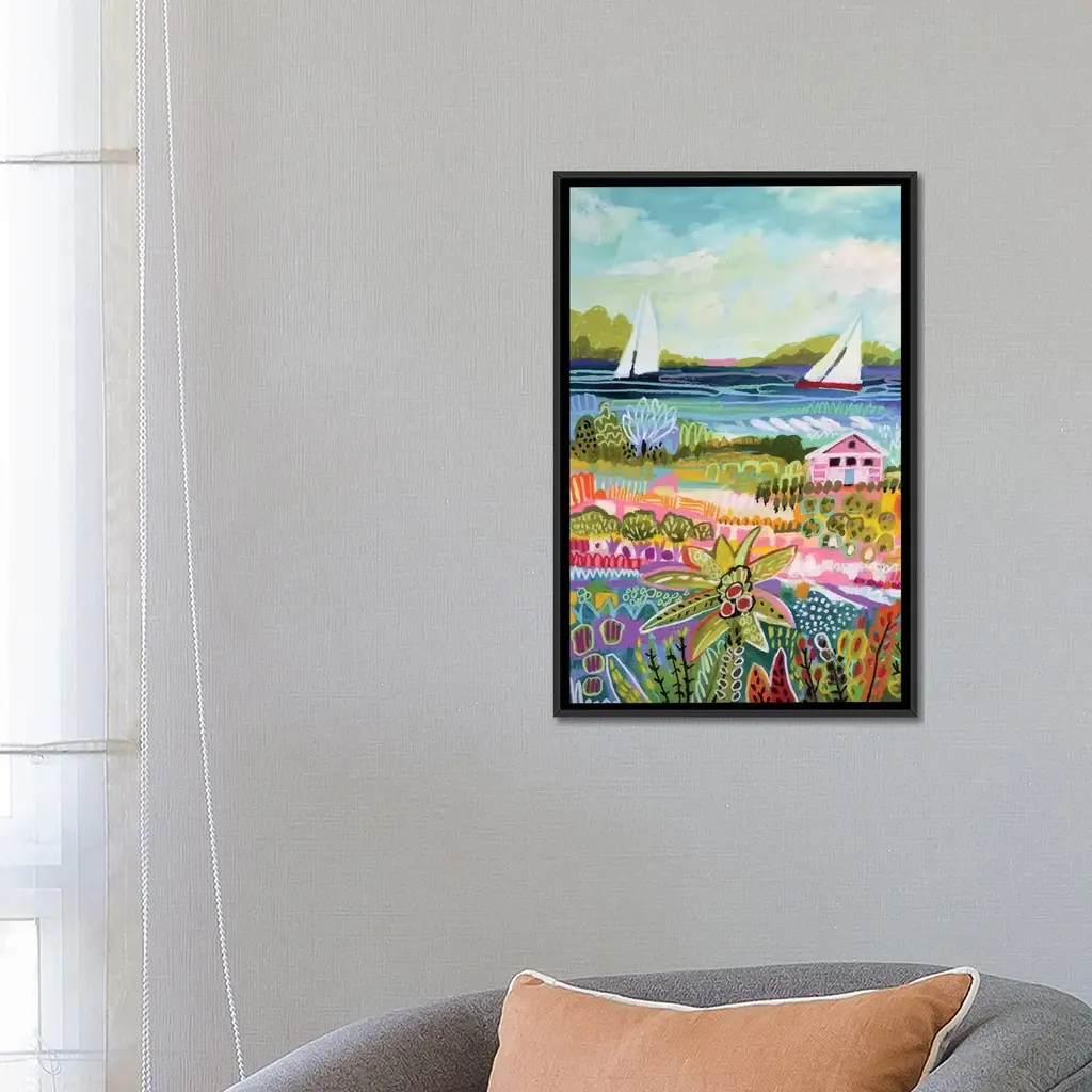 Icanvas "Two Sailboats And Cottage I" By Karen Fields Framed Canvas Print - White - 48x32