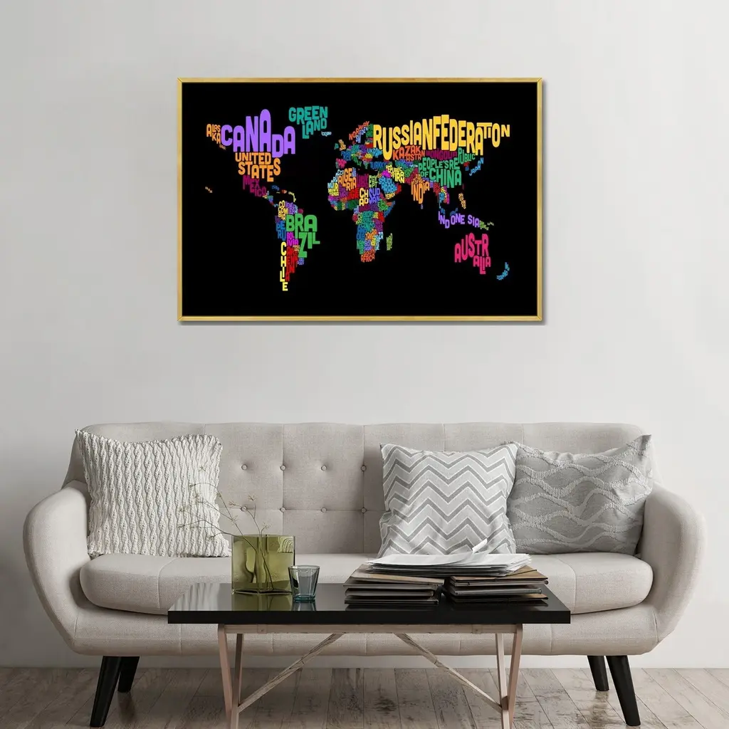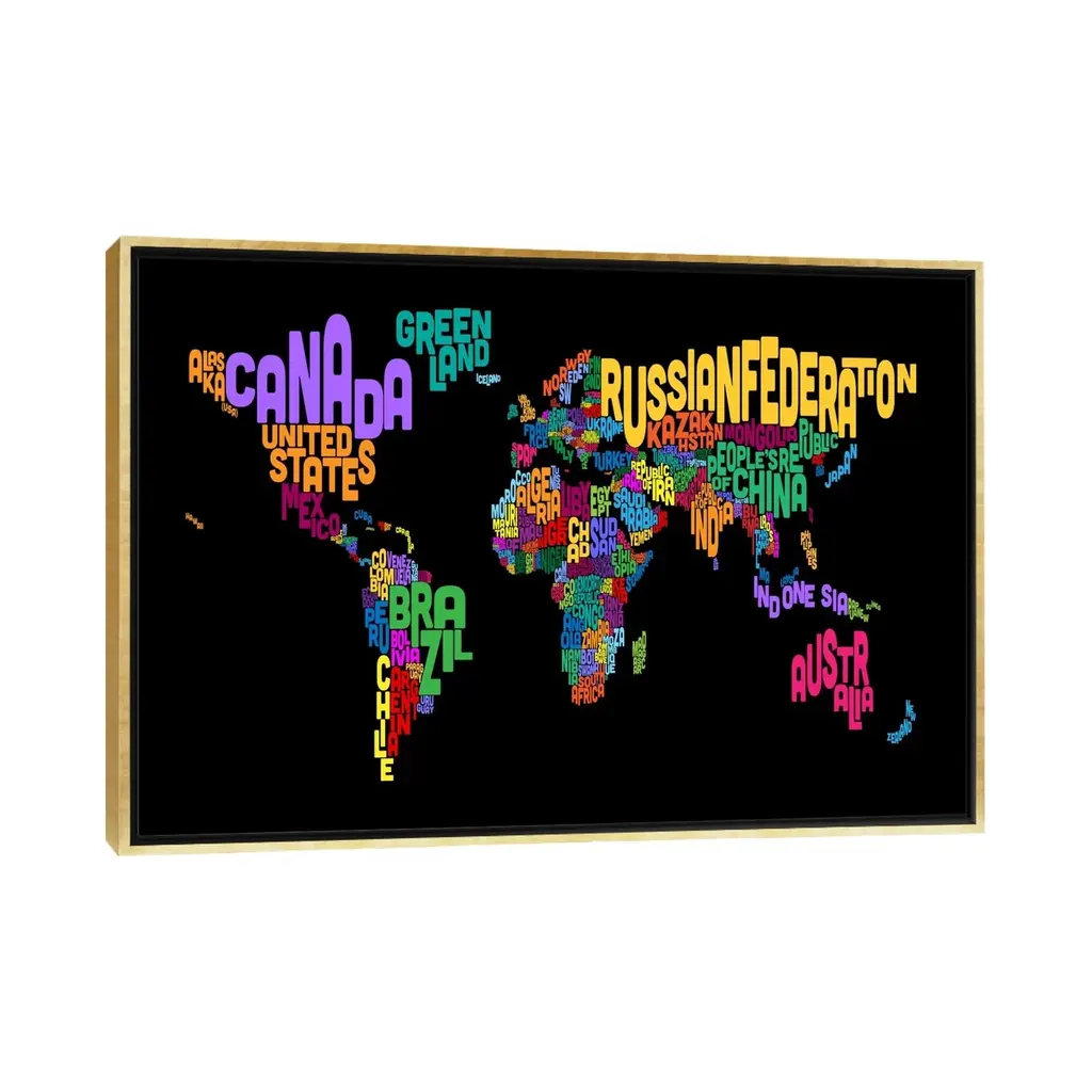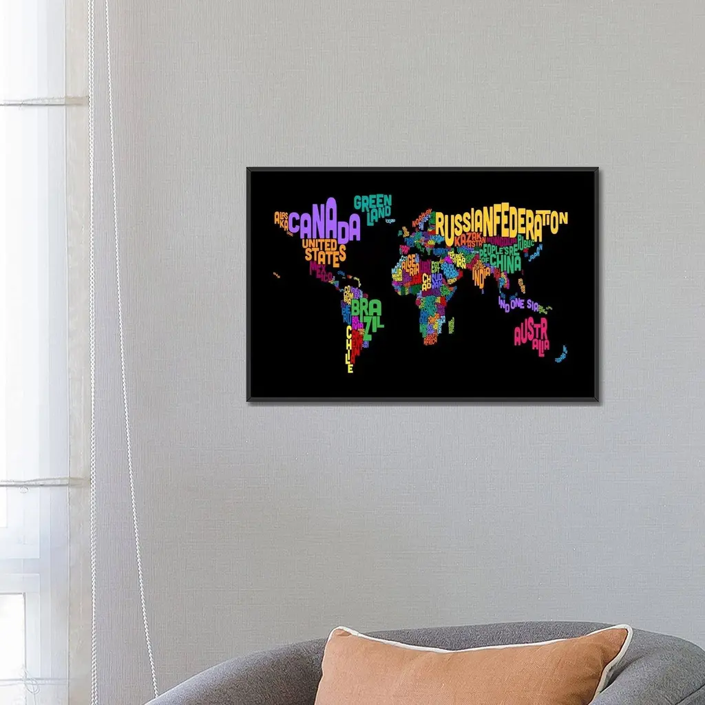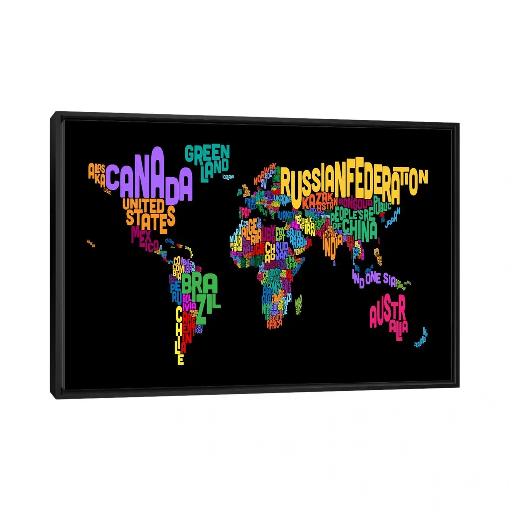 Icanvas "Typographic Text World Map Ii (Black)" By Michael Tompsett Framed Canvas Print - Black - 26x40