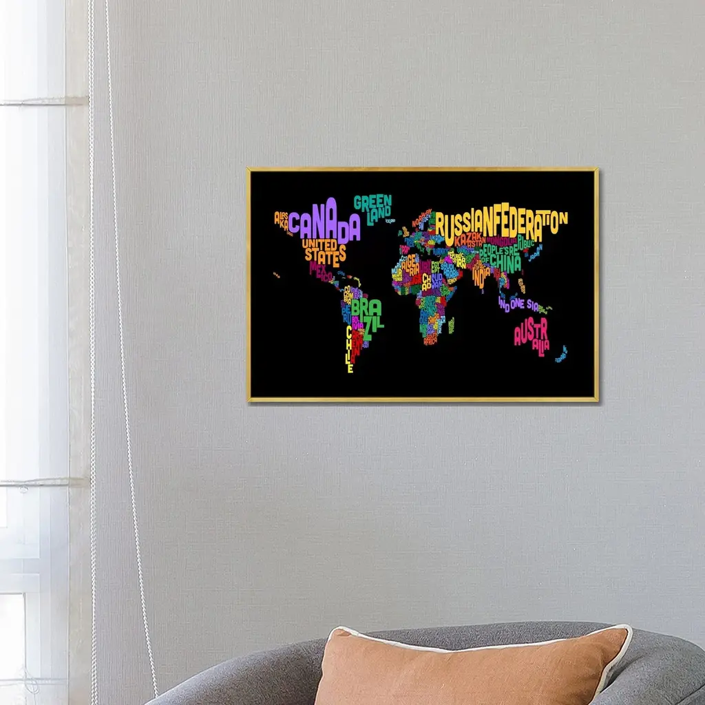 Icanvas "Typographic Text World Map Ii (Black)" By Michael Tompsett Framed Canvas Print - Gold - 26x40