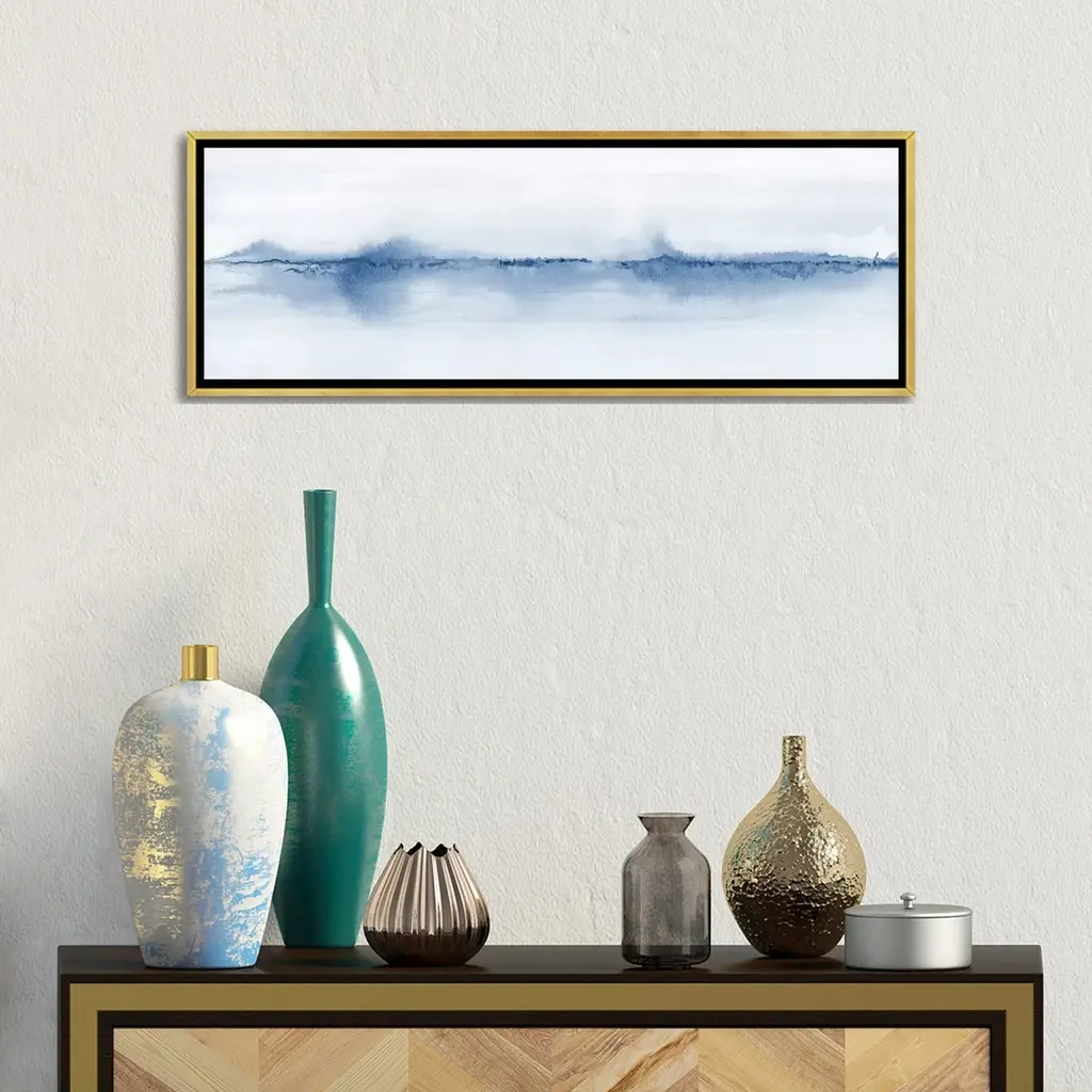 Icanvas "Watercolor Landscape V - Shades Of Blue - Panoramic" By Nouveau Prints Framed Canvas Print - 12x36 - Gold