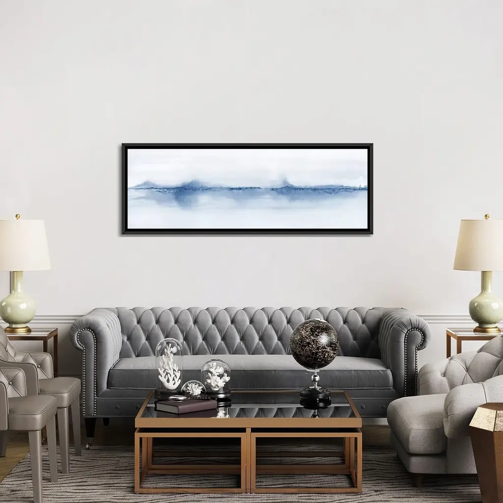 Icanvas "Watercolor Landscape V - Shades Of Blue - Panoramic" By Nouveau Prints Framed Canvas Print - 20x60 - Black