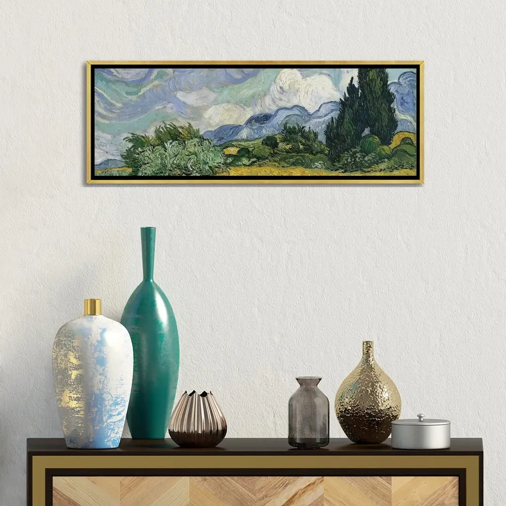 Icanvas "Wheat Field With Cypresses, June-July 1889 (Metropolitan Museum Of Art, Nyc)" By Vincent Van Gogh Framed Canvas Print - 12x36 - Gold