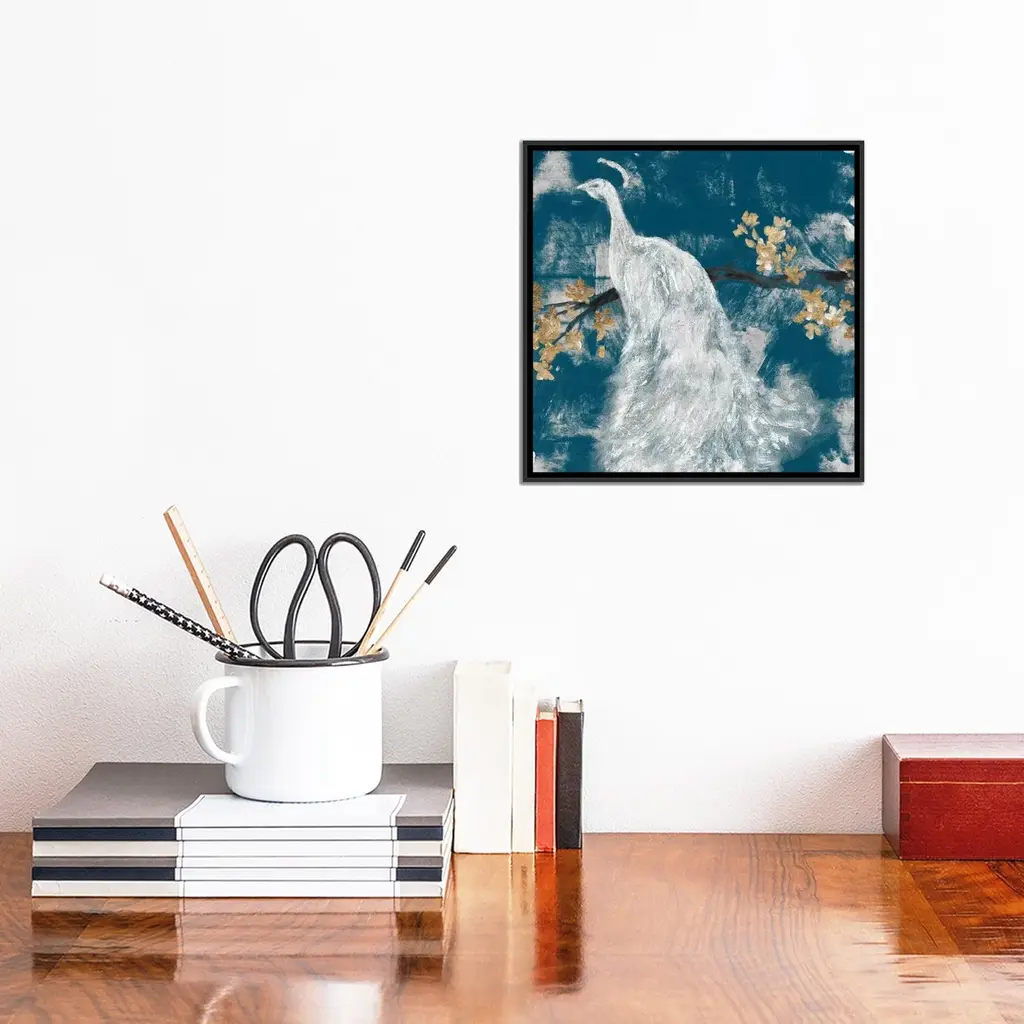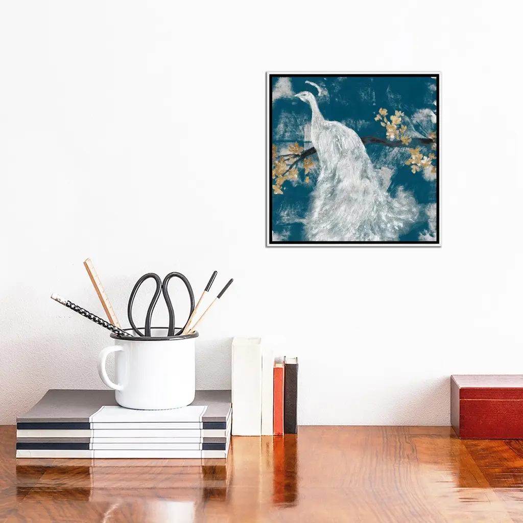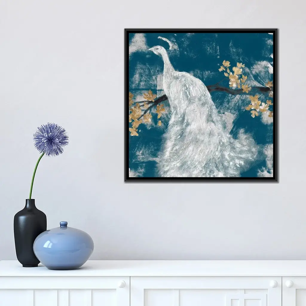 Icanvas "White Peacock On Indigo Ii" By Jennifer Goldberger Framed Canvas Print - Black - 26x26