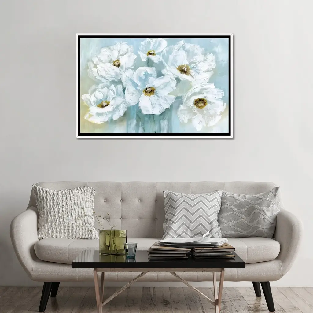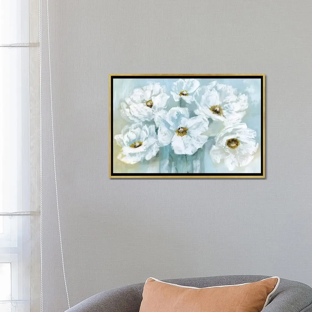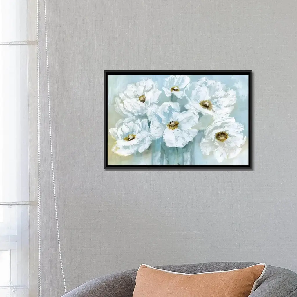 Enhance your space with the beauty of the "White Poppy Bouquet" by Nan Framed from iCanvas. This exquisite artwork is expertly printed on artist-grade canvas using Giclee technology, providing the texture and appearance of a fine-art painting. Crafted in the USA, the canvas is professionally hand-stretched and stapled over North American pine-wood bars in a Gallery Wrap style. The 2-inch thick hard wood frame adds elegance, with the art inset to create a captivating "floating" illusion. With fade-resistant archival inks, the colors remain vibrant for years to come, even in bright light. Experience contemporary style and stunning detail with this exceptional piece.Features: