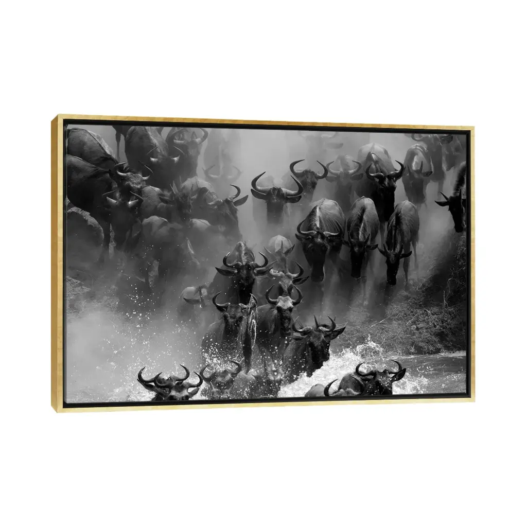 Add brilliance to your space with the "Wildebeest Crossing" framed canvas artwork by Mogens Trolle. Crafted in the USA with artist-grade canvas, this Giclee artwork offers the texture, look, and feel of a fine-art painting. Professionally hand-stretched and stapled over North American pine-wood bars in a Gallery Wrap style, it is mounted to a 2-inch thick, elegant hardwood frame. The art is inset, creating a "floating" illusion with a 3/8" space between the art and frame. Fade-resistant archival inks guarantee vibrant color reproduction that lasts for decades. Elevate your decor with this contemporary and uncompromising style!Features: