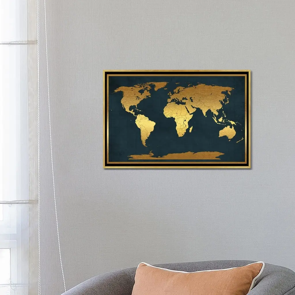 Icanvas "World Map Vintage Style Black Gold" By Walldecoraddict Framed Canvas Print - Black - 26x40