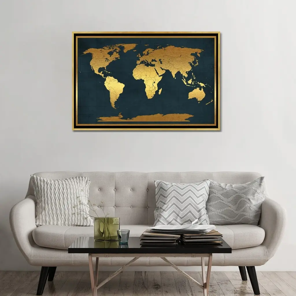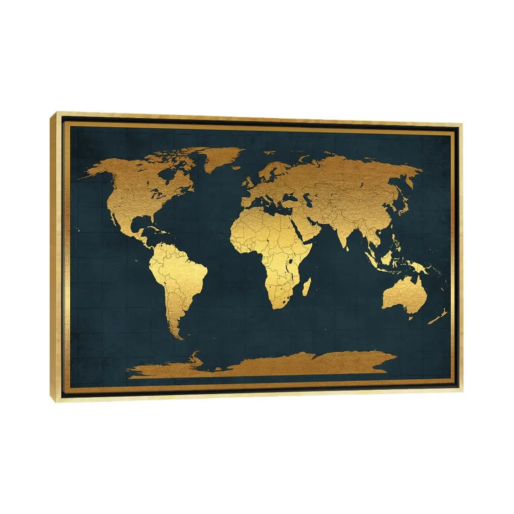 Icanvas "World Map Vintage Style Black Gold" By Walldecoraddict Framed Canvas Print - Gold - 18x26