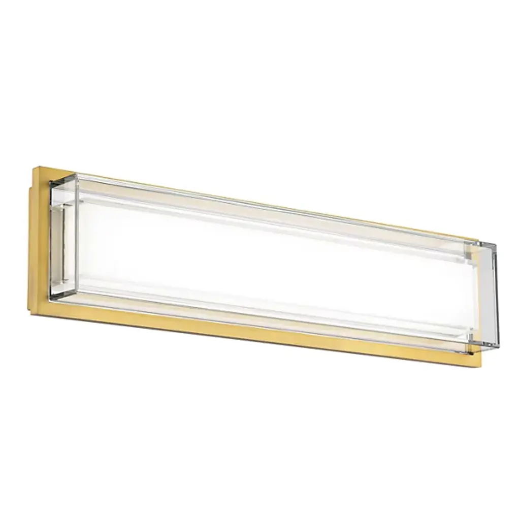 The Ice Bar LED Vanity Light from Modern Forms layers clear glass over etched glass to create depth within a rectangular illuminated panel. The substantial aluminum backplate provides structural support while concealed LEDs illuminate the etched interior surface. Silk-screened glass diffusion ensures even light distribution across the fixture face while the clear outer glass protects the etched texture. Color temperature adjustment allows for customization to suit various bathroom tasks and times of day. The layered glass construction creates visual interest through material transparency while maintaining consistent brightness levels.