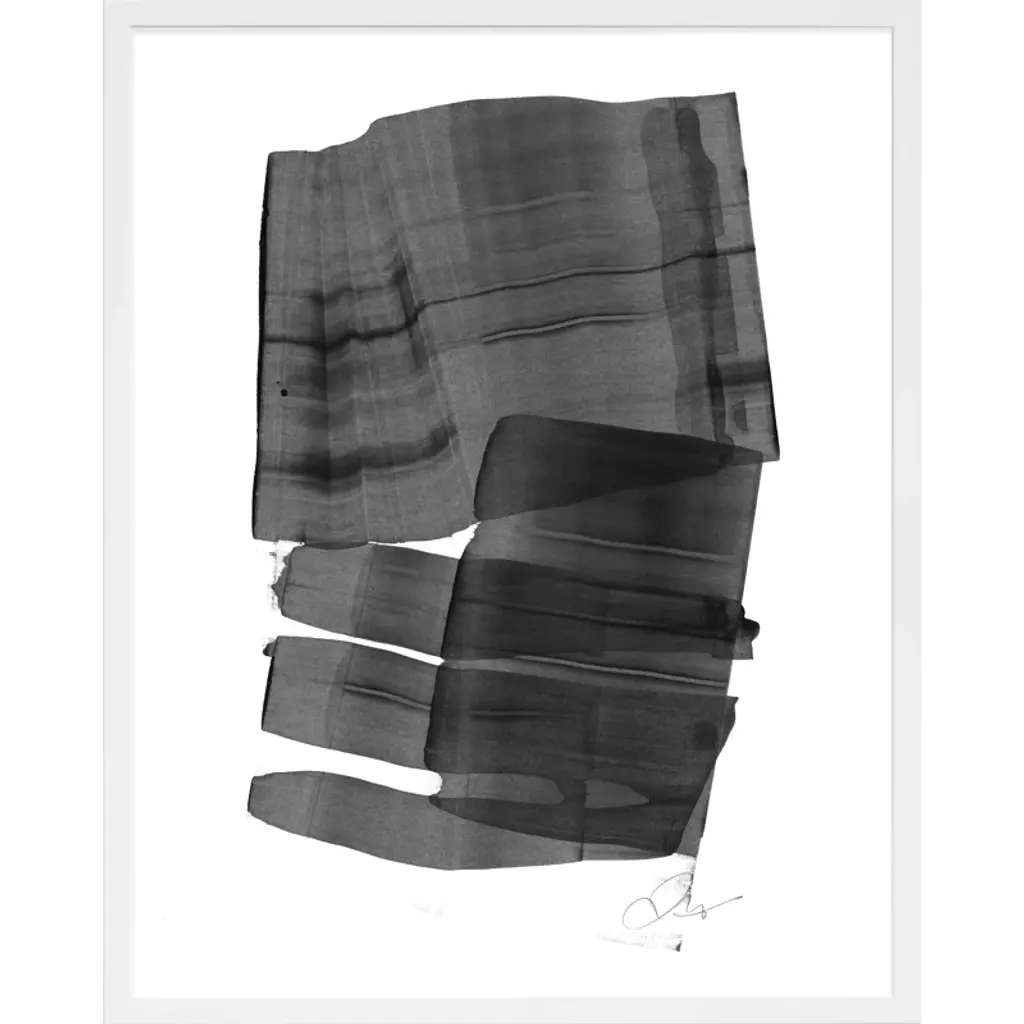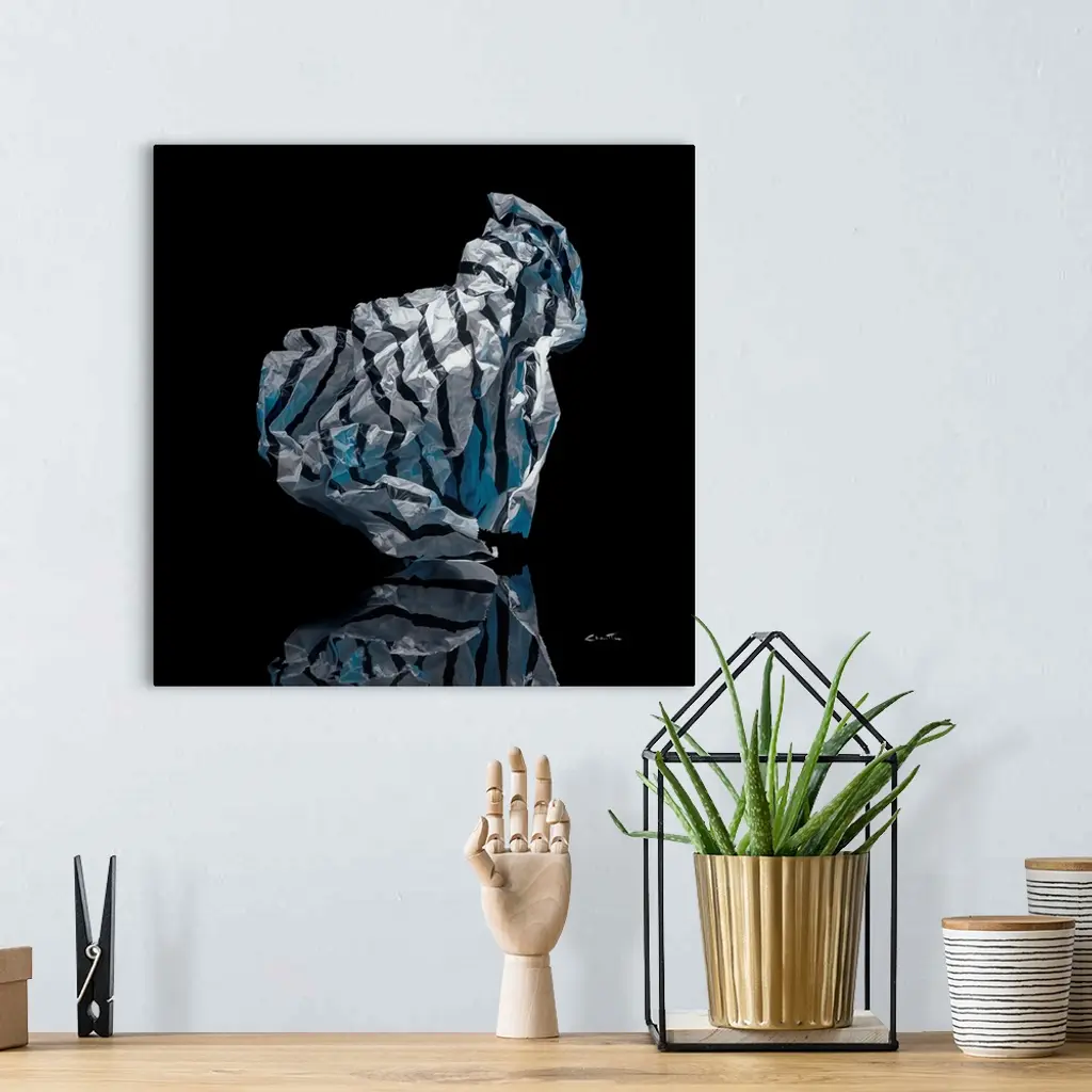 Contemporary vivid realistic still-life painting of a crumpled up piece of black striped tissue paper, on top of a reflective surface.