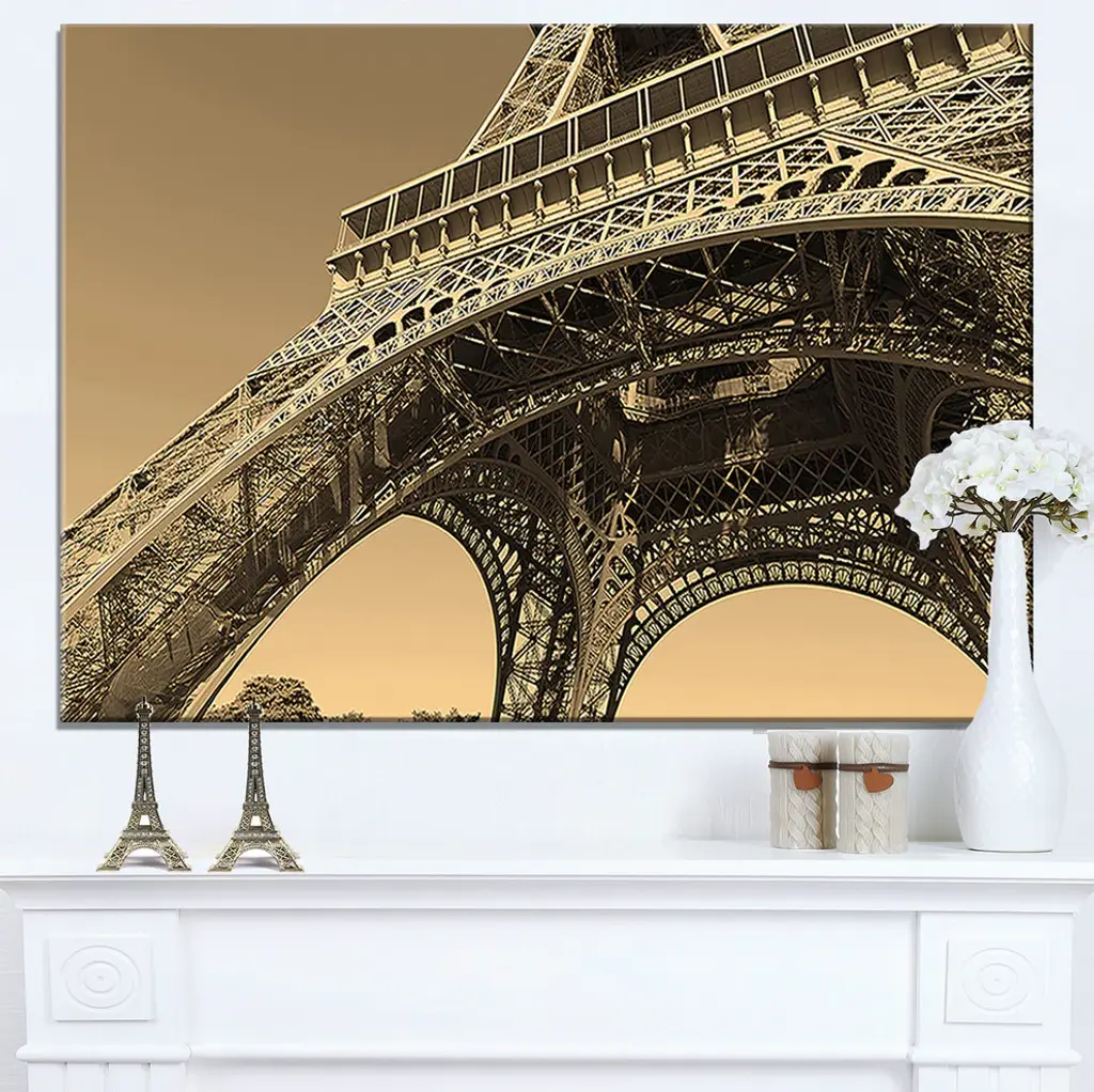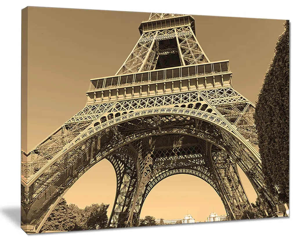 The Iconic Paris Eiffel Tower Side View from Ground canvas art print is sure to make an impression on anyone who sees it. This artwork is gallery wrapped around a 1-inch solid wood frame and arrives carefully packaged and entirely ready to hang on the wall. Design Art only uses the highest resolution and pigments to ensure a crisp colorful print that is never faded or pixelated. This artwork is sure to be a conversation starter in any home or office.
