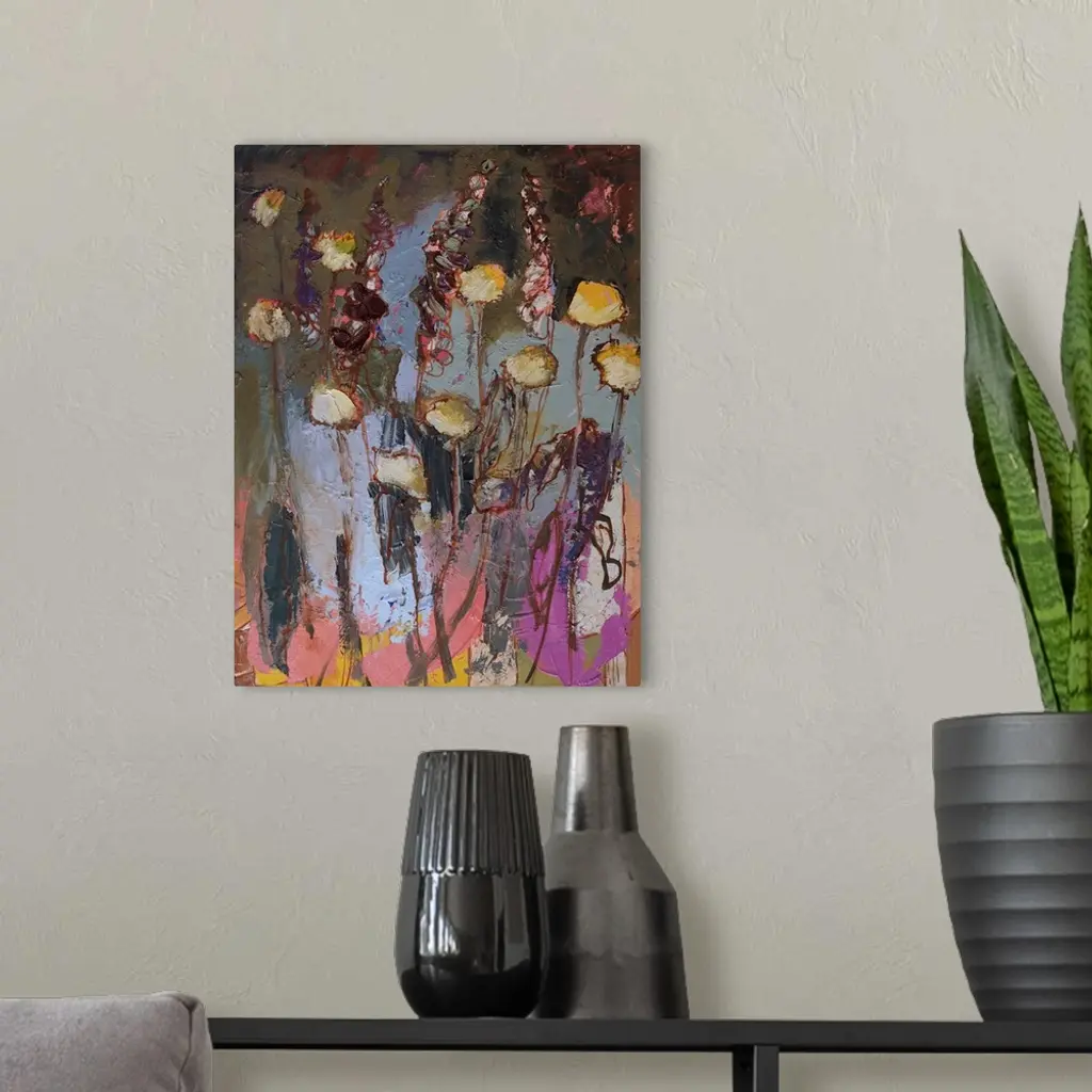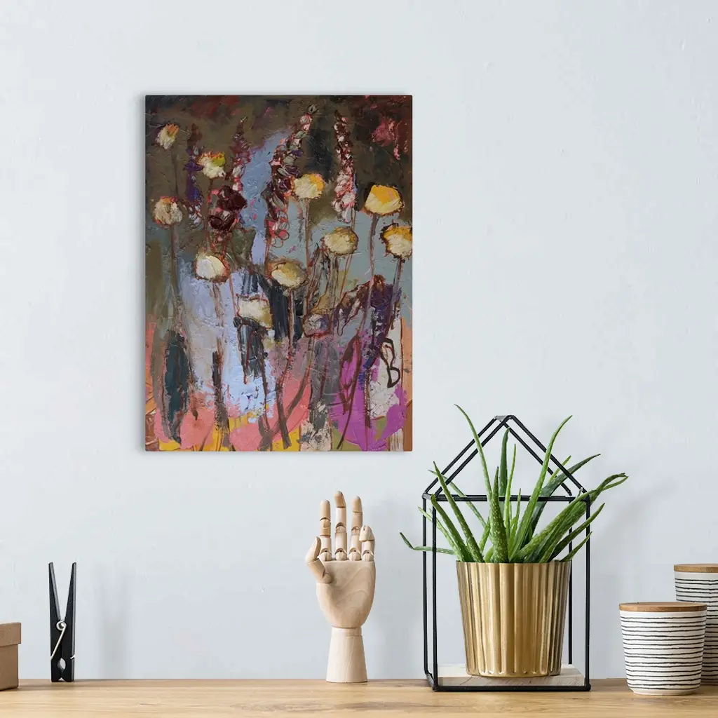 A color filled floral painting with light cream colored flowers on a dark olive green background