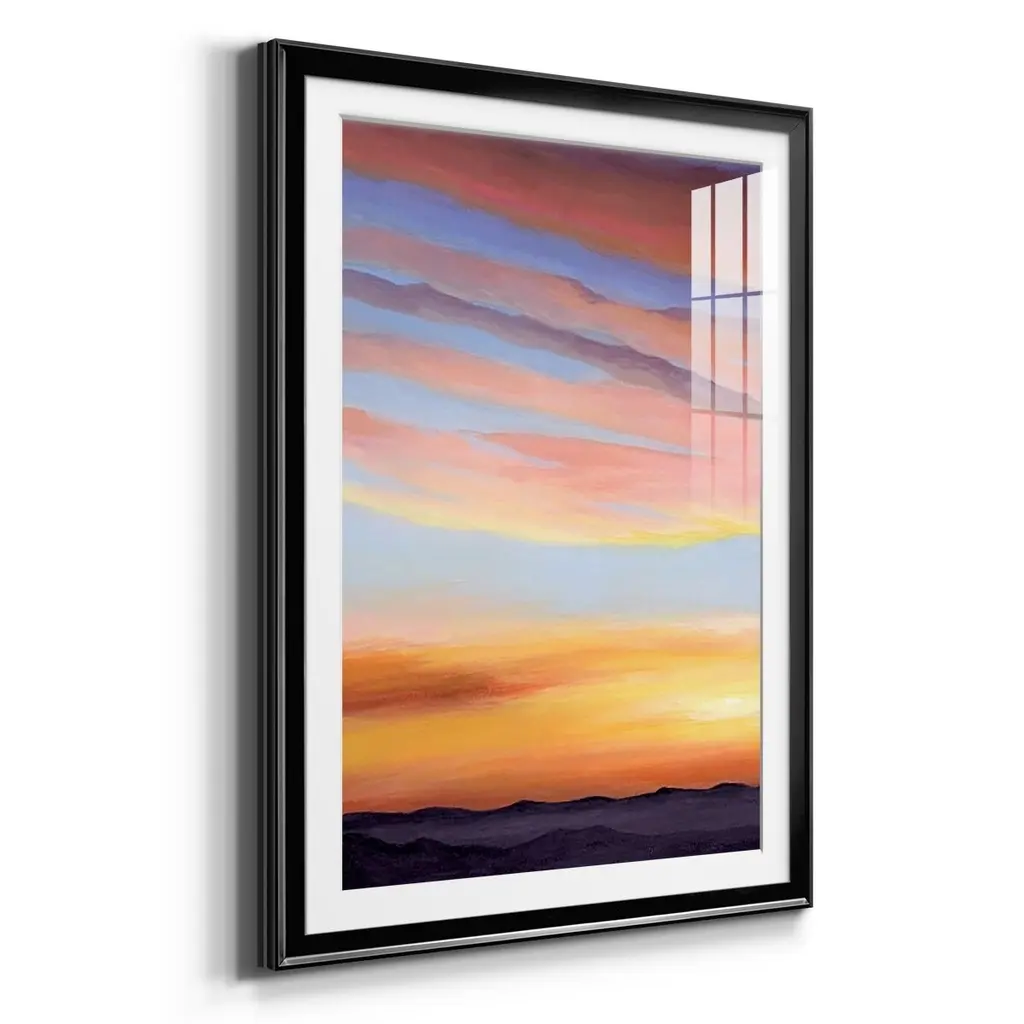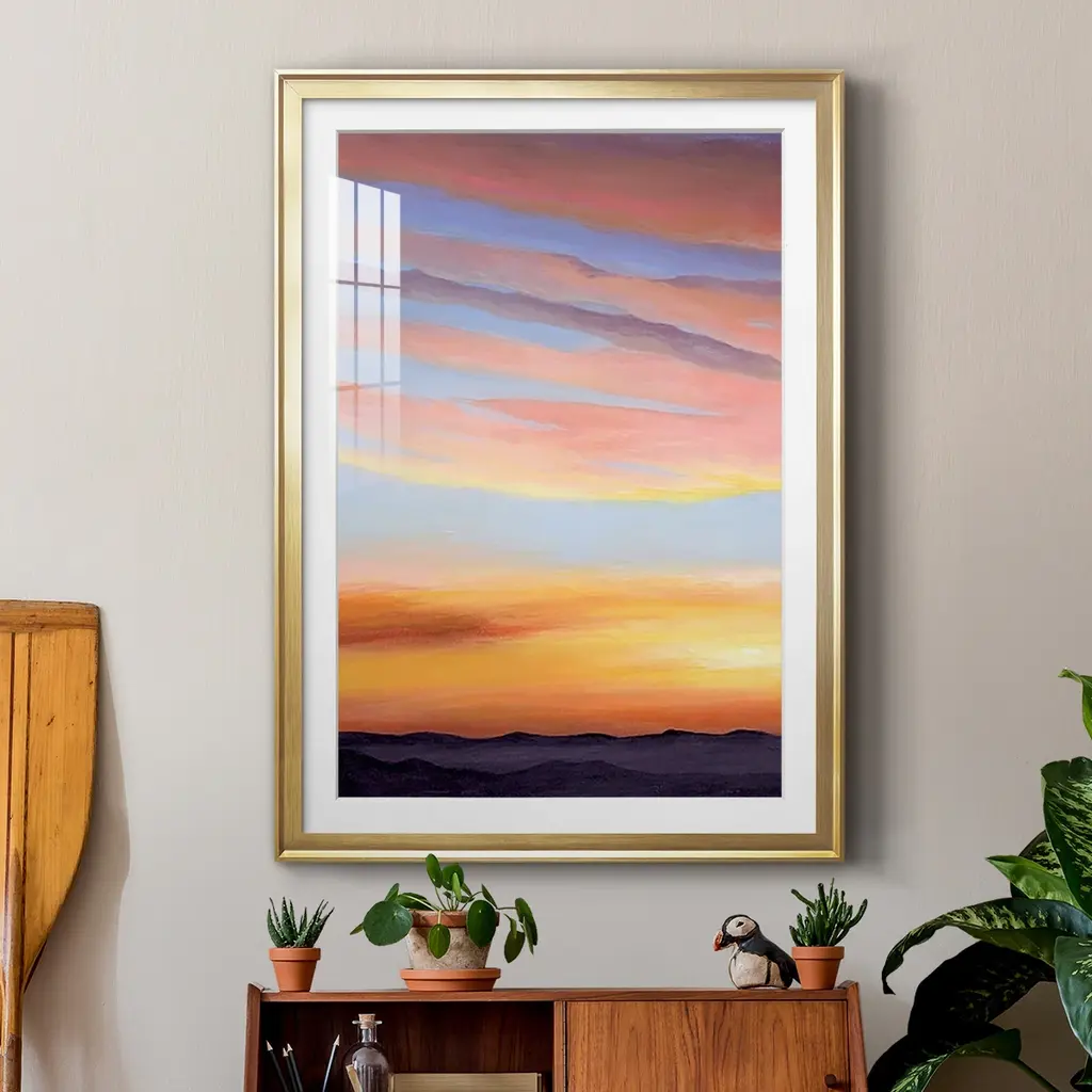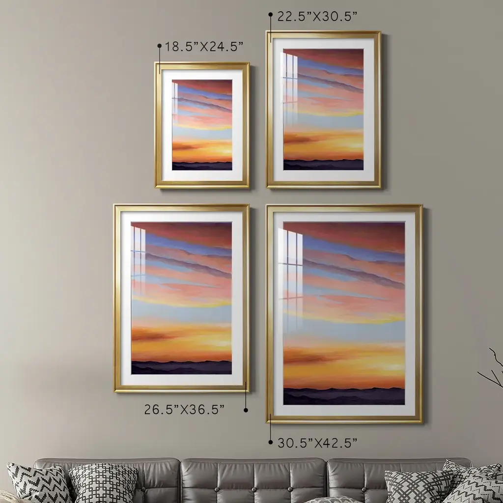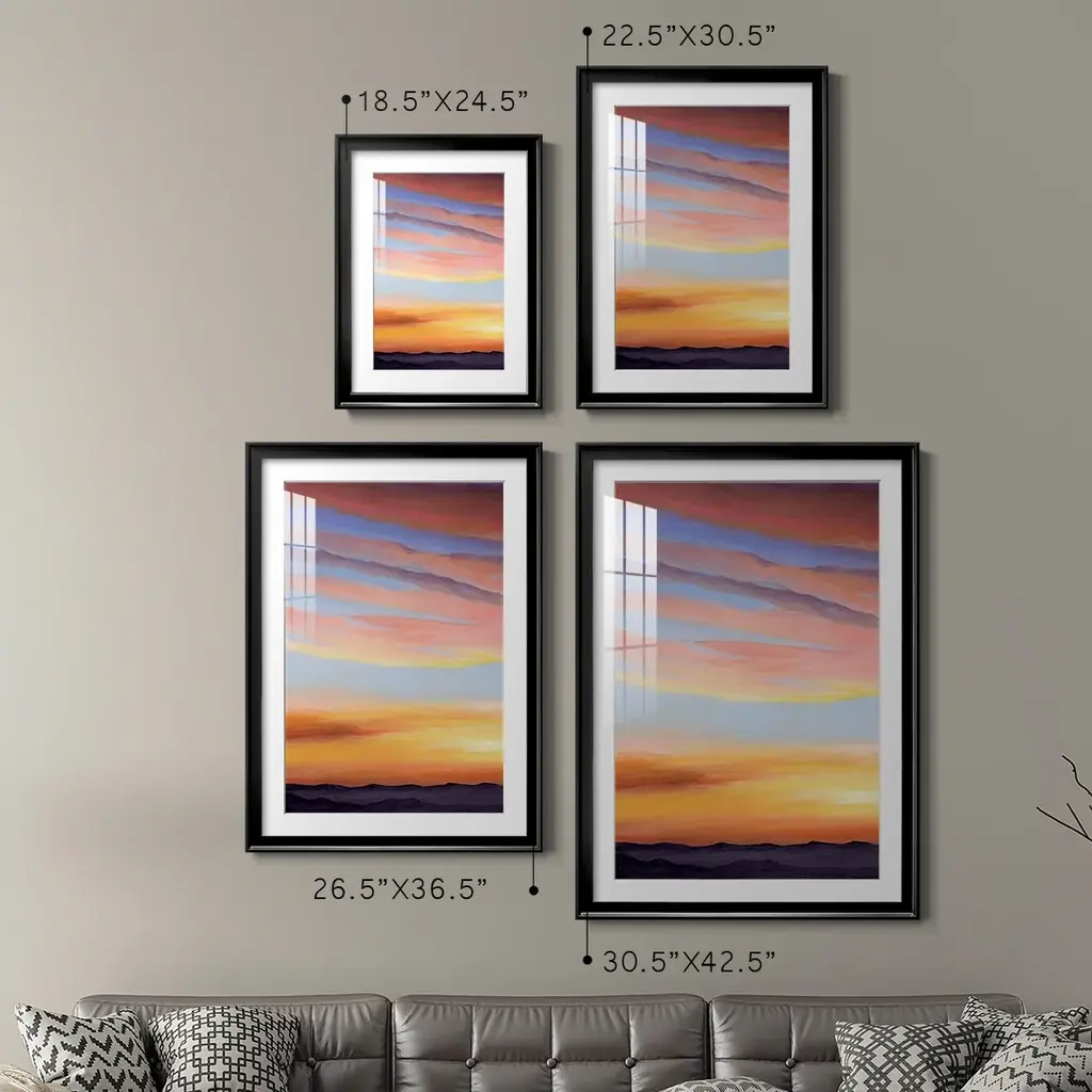 Ignited Dusk I Premium Framed Print - Ready to Hang A Premium Framed Print created to last. Framed in distressed wood and available in an array of sizes and colors Featuring a beveled a solid wood stretcher bar, each piece comes ready to hand 4 SIZES AVAILABLE 30.5''X42.5'' - Overall Size 26.5'X36.5'' - Overall Size 22.5''x30.5'' - Overall Size 18.5''x24.5'' - Overall Size Each piece is made to order. Each piece comes with hanging hardware. Made in the USA Ready to Hang Giclee Paper Print Acrylic Glass Beveled Matt Board