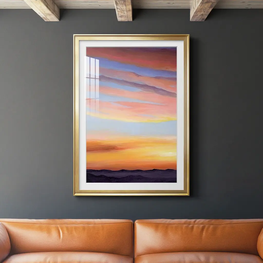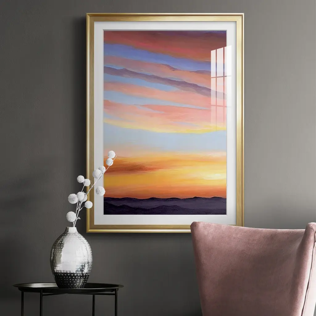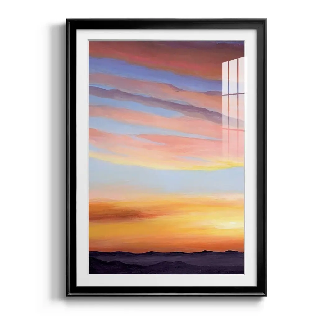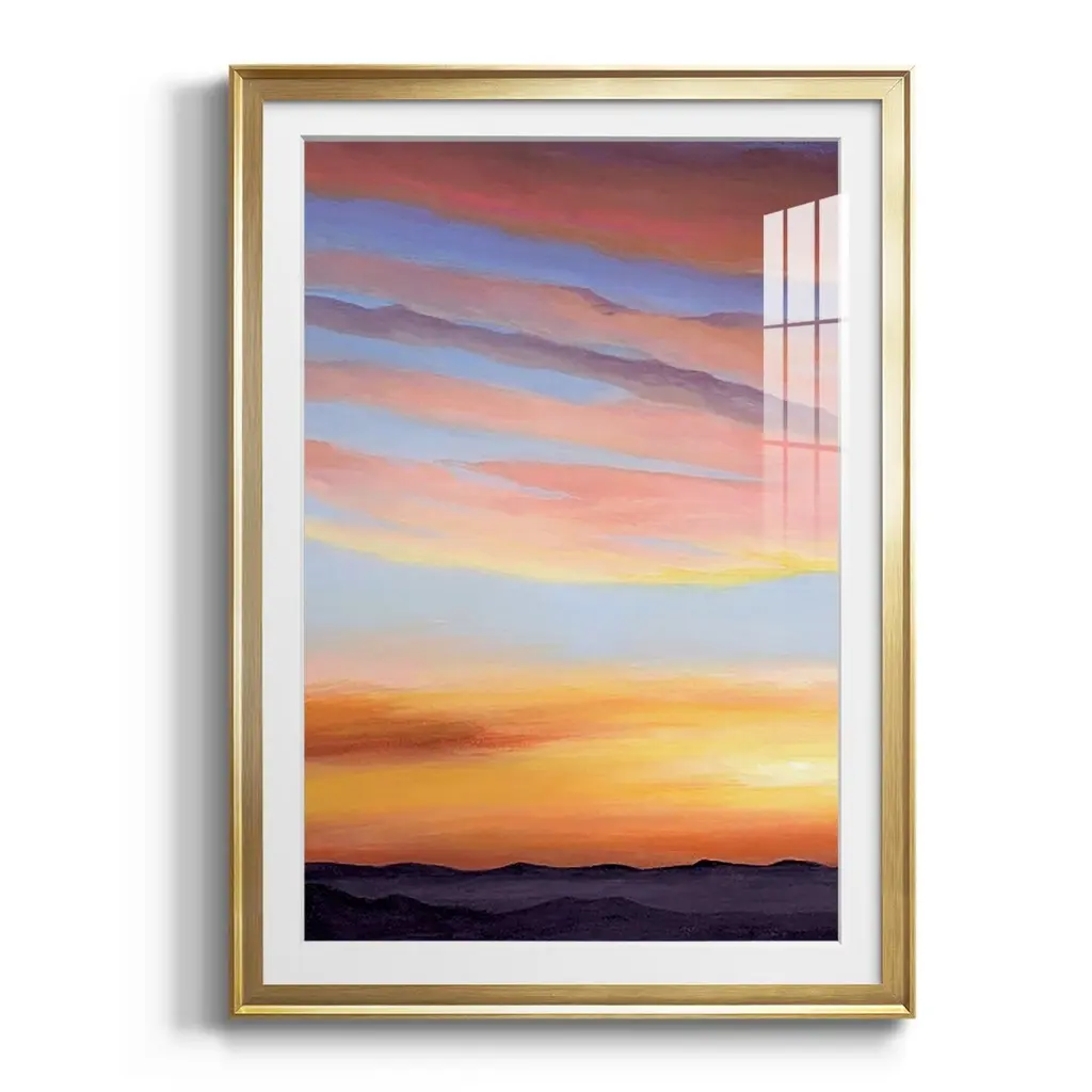 Ignited Dusk I Premium Framed Print - Ready to Hang A Premium Framed Print created to last. Framed in distressed wood and available in an array of sizes and colors Featuring a beveled a solid wood stretcher bar, each piece comes ready to hand 4 SIZES AVAILABLE 30.5''X42.5'' - Overall Size 26.5'X36.5'' - Overall Size 22.5''x30.5'' - Overall Size 18.5''x24.5'' - Overall Size Each piece is made to order. Each piece comes with hanging hardware. Made in the USA Ready to Hang Giclee Paper Print Acrylic Glass Beveled Matt Board