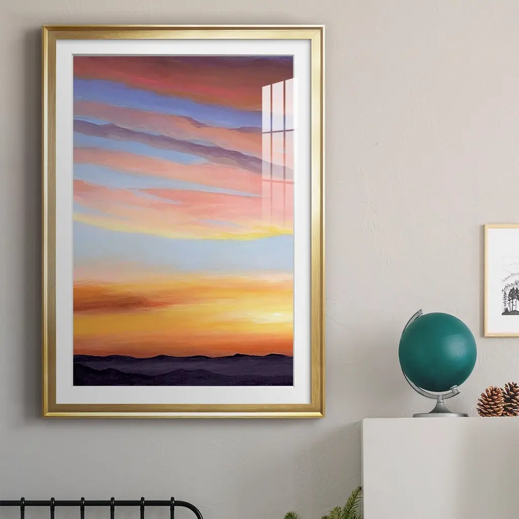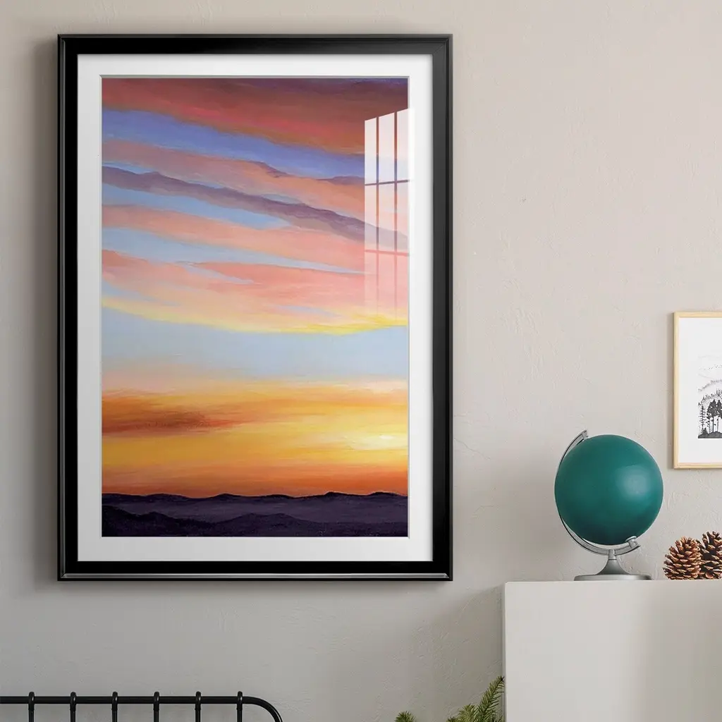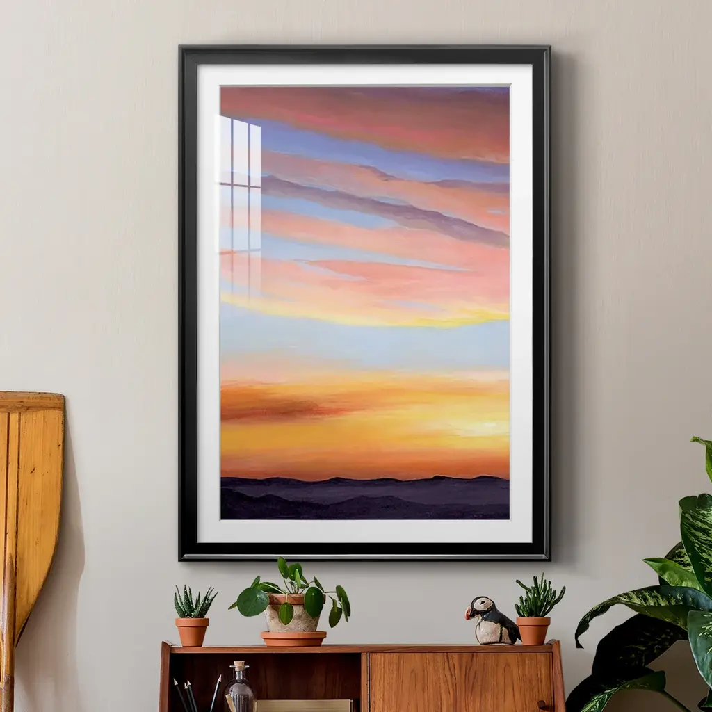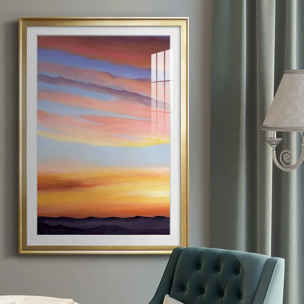 Ignited Dusk I Premium Framed Print - Ready to Hang A Premium Framed Print created to last. Framed in distressed wood and available in an array of sizes and colors Featuring a beveled a solid wood stretcher bar, each piece comes ready to hand 4 SIZES AVAILABLE 30.5''X42.5'' - Overall Size 26.5'X36.5'' - Overall Size 22.5''x30.5'' - Overall Size 18.5''x24.5'' - Overall Size Each piece is made to order. Each piece comes with hanging hardware. Made in the USA Ready to Hang Giclee Paper Print Acrylic Glass Beveled Matt Board