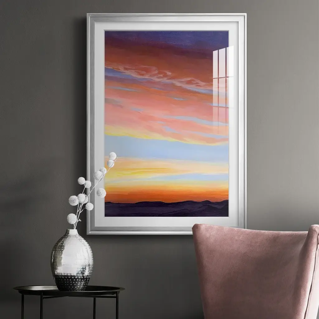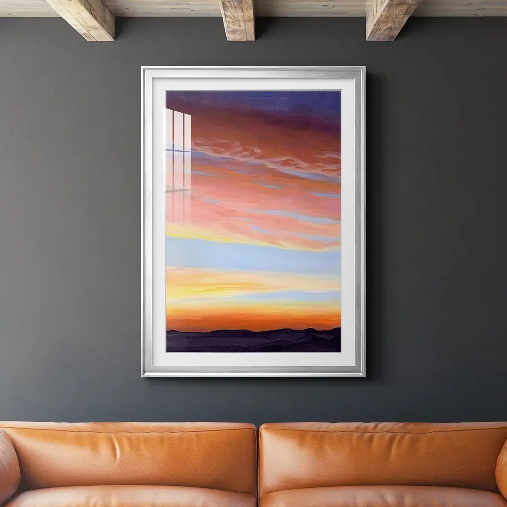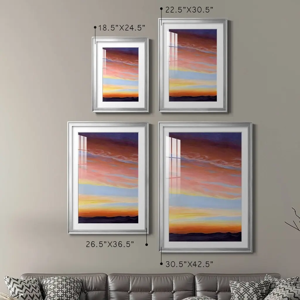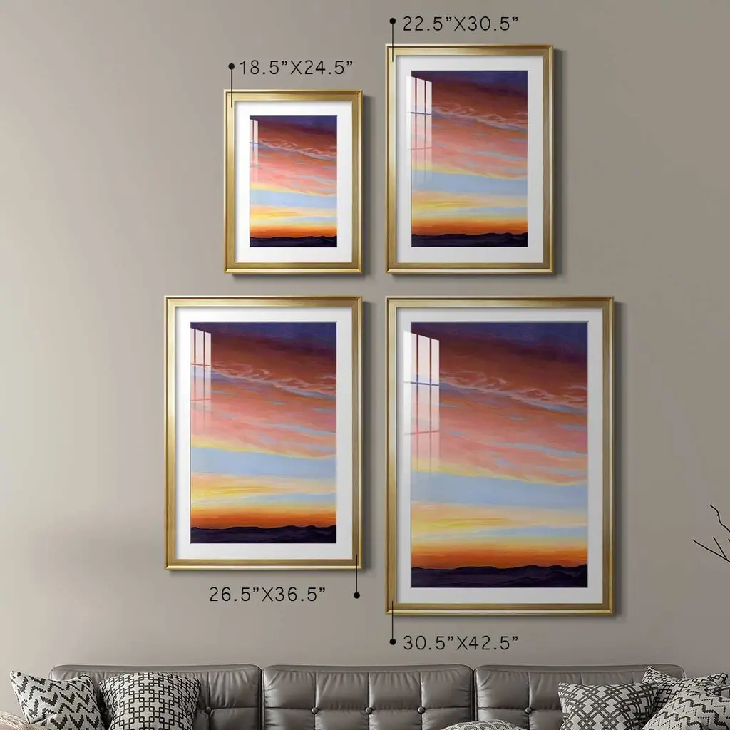 Ignited Dusk II Premium Framed Print - Ready to Hang A Premium Framed Print created to last. Framed in distressed wood and available in an array of sizes and colors Featuring a beveled a solid wood stretcher bar, each piece comes ready to hand 4 SIZES AVAILABLE 30.5''X42.5'' - Overall Size 26.5'X36.5'' - Overall Size 22.5''x30.5'' - Overall Size 18.5''x24.5'' - Overall Size Each piece is made to order. Each piece comes with hanging hardware. Made in the USA Ready to Hang Giclee Paper Print Acrylic Glass Beveled Matt Board