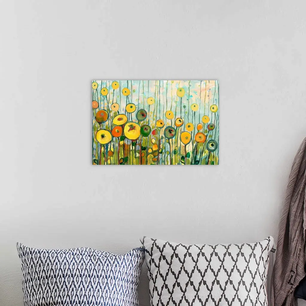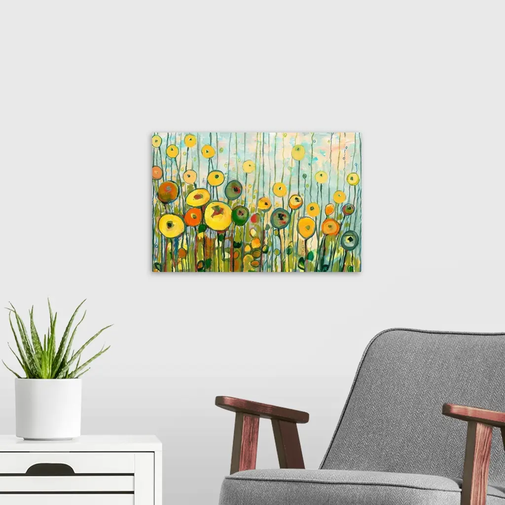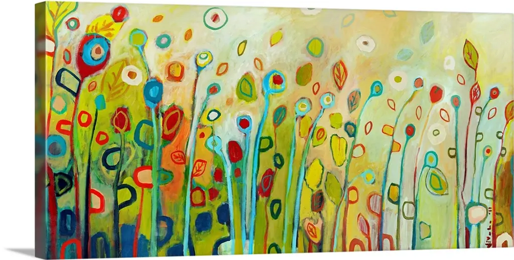 Still life painting of floral pods reminiscent of olives in this abstract landscape.