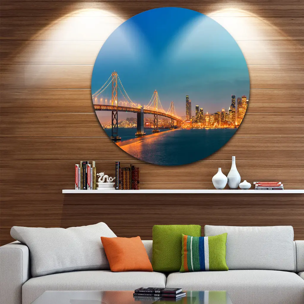Bring Contemporary Abstraction to your home with this large Circle Metal wall art. This Illuminated San Francisco Skyline Metal Artwork makes it the focal point of any room or office. - White Gloss Coating ensures colors are extra vibrant with light reflection.- Aluminum grade Sheet Metal with 1 inch mounting frame on the back giving the illusion that the artwork is floating on the wall..- Mounting Brackets are included along with instructions.- High Quality Digital images are created directly into a glossy aluminum panel producing a stunning and captivating print into the glossy finish of the metal.- Water, Fire and Scratch resistant HD Aluminum panels.- Looks better than any photo paper and guaranteed to last at least 20 years- Easy to clean with a microfiber cloth. Colors are far superior to regular Canvas Art. - Easy to Hang