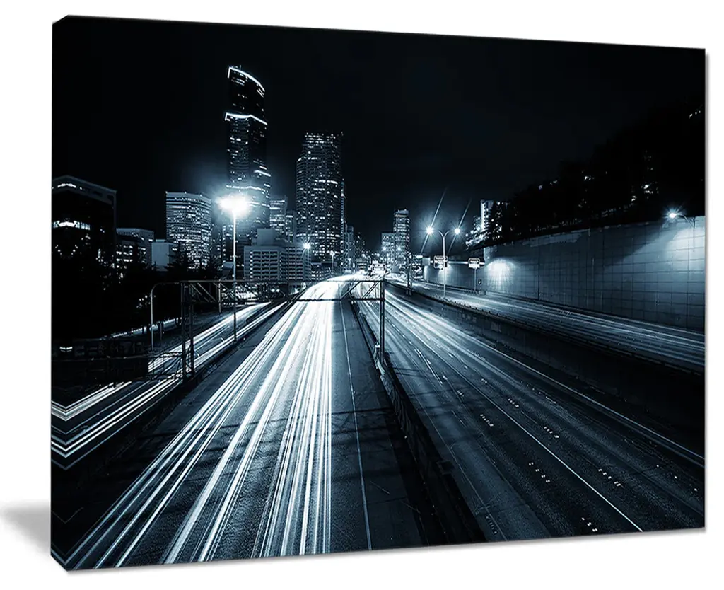 The Illuminated Traffic Trail in Downtown Seattle canvas art print is sure to make an impression on anyone who sees it. This artwork is gallery wrapped around a 1-inch solid wood frame and arrives carefully packaged and entirely ready to hang on the wall. Design Art only uses the highest resolution and pigments to ensure a crisp colorful print that is never faded or pixelated. This artwork is sure to be a conversation starter in any home or office.
