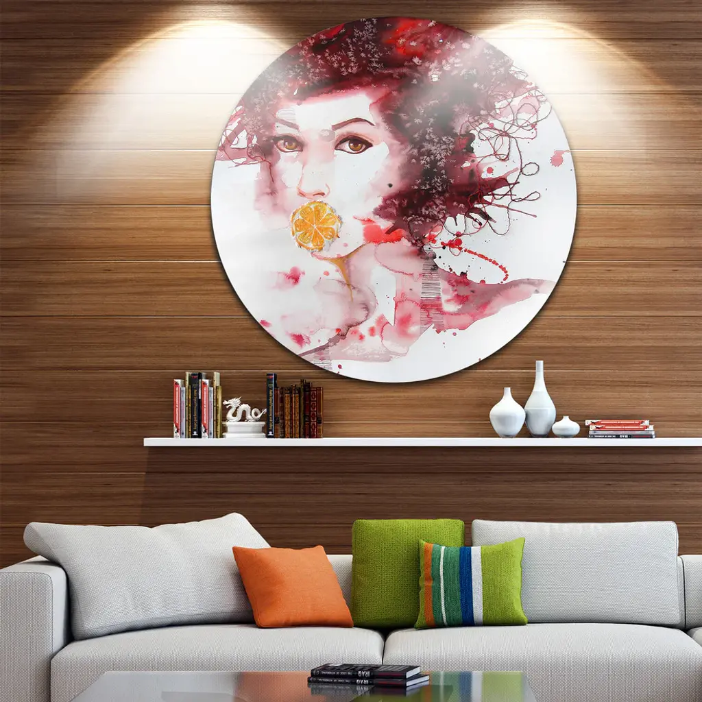 Illustrated Girl With Red Hair, Portrait Round Metal Wall Art, 23"