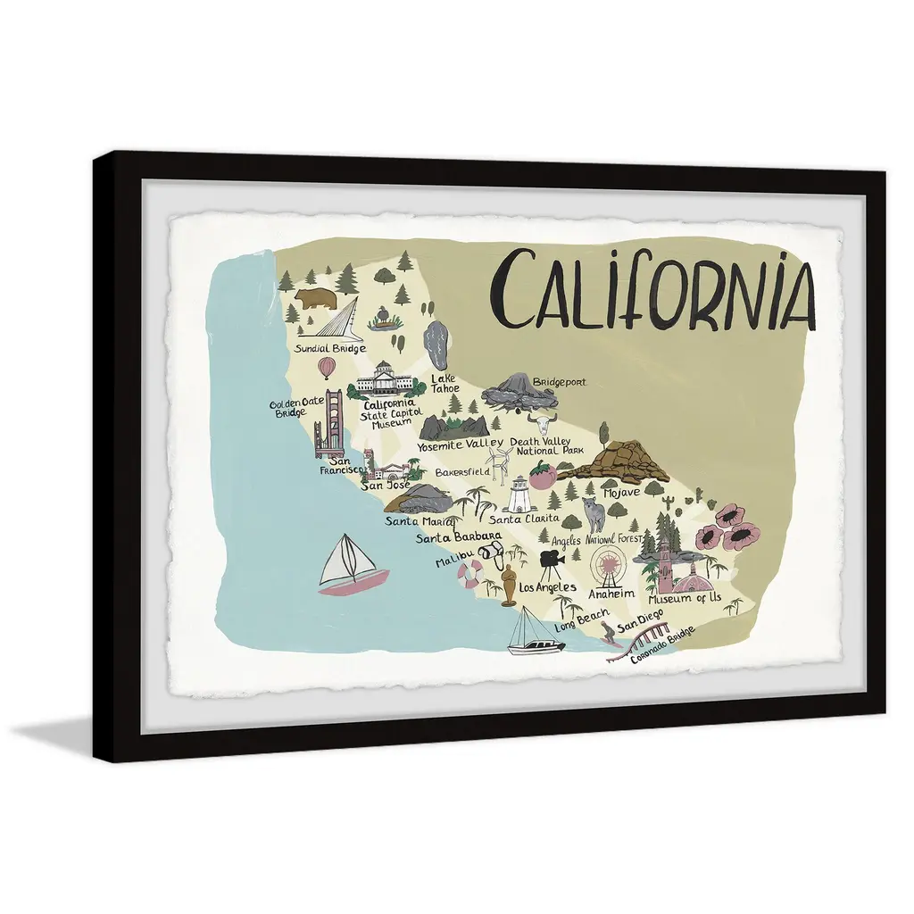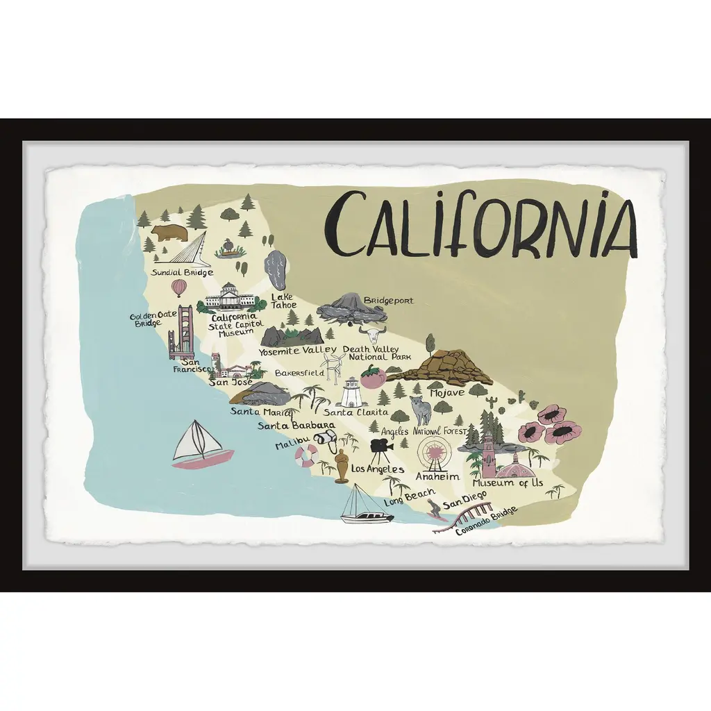 Reminisce like a tourist with this California print that showcases each memorable landmark and where it stands. Proudly printed in the USA, this piece is printed on high quality archive paper and professionally hand-framed. With wall-mounting hooks included, this artful accent is ready to hang up as soon as it reaches your front door. • Top quality Giclee print on high resolution Archive Paper • Hand cut deckled edges • High quality durable non-warping frame • Finished under shatter resistant plexiglass • Arrives ready to hang • Includes a certificate of authenticity • Printed the USA