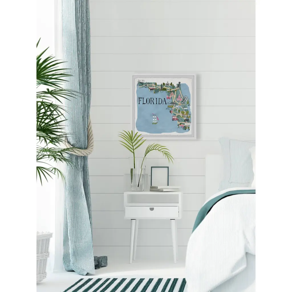 Put your love for Florida on display with this print of the Florida coast, its most memorable landmarks, and all that it represents. Proudly printed in the USA, this piece is printed on high quality archive paper and professionally hand-framed. With wall-mounting hooks included, this artful accent is ready to hang up as soon as it reaches your front door. • Top quality Giclee print on high resolution Archive Paper • Hand cut deckled edges • High quality durable non-warping frame • Finished under shatter resistant plexiglass • Arrives ready to hang • Includes a certificate of authenticity • Printed in the USA