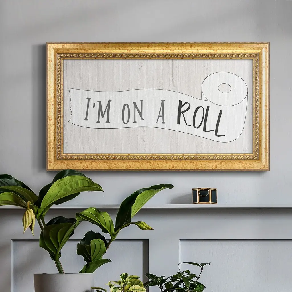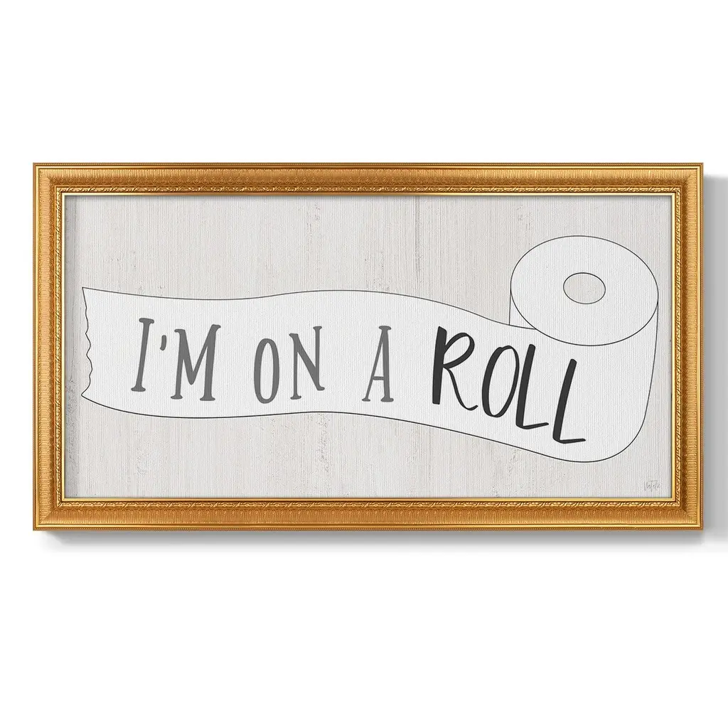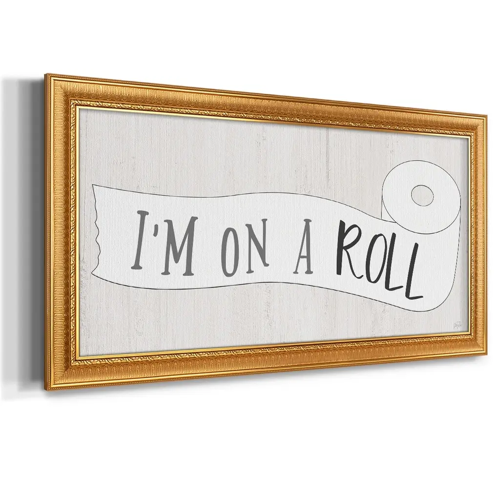 I'm on a Roll Premium Framed Canvas- Ready to Hang A Premium Framed Canvas created to last. Framed in distressed wood and available in an array of sizes and colors Featuring a beveled a solid wood stretcher bar, each piece comes ready to hand 3 SIZES AVAILABLE 21''X37'' - Overall Size 25''X45'' - Overall Size 29''x53'' - Overall Size Each piece is made to order. Each piece comes with hanging hardware. Made in the USA Ready to Hang Giclee Paper Print Acrylic Glass Beveled Matt Board