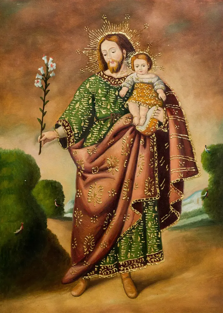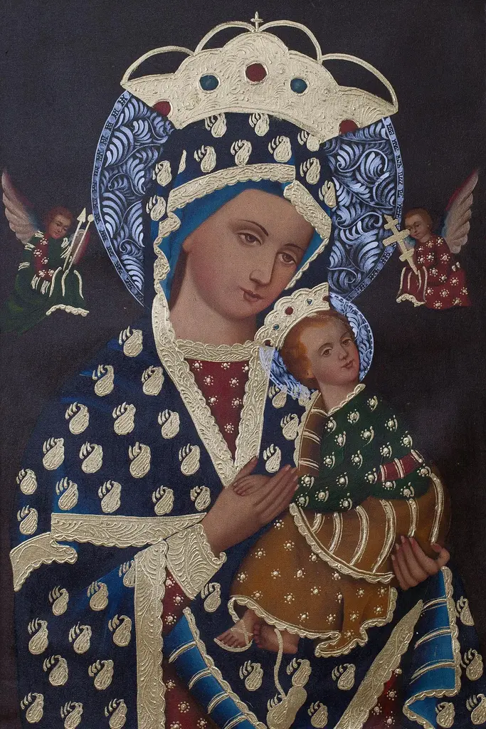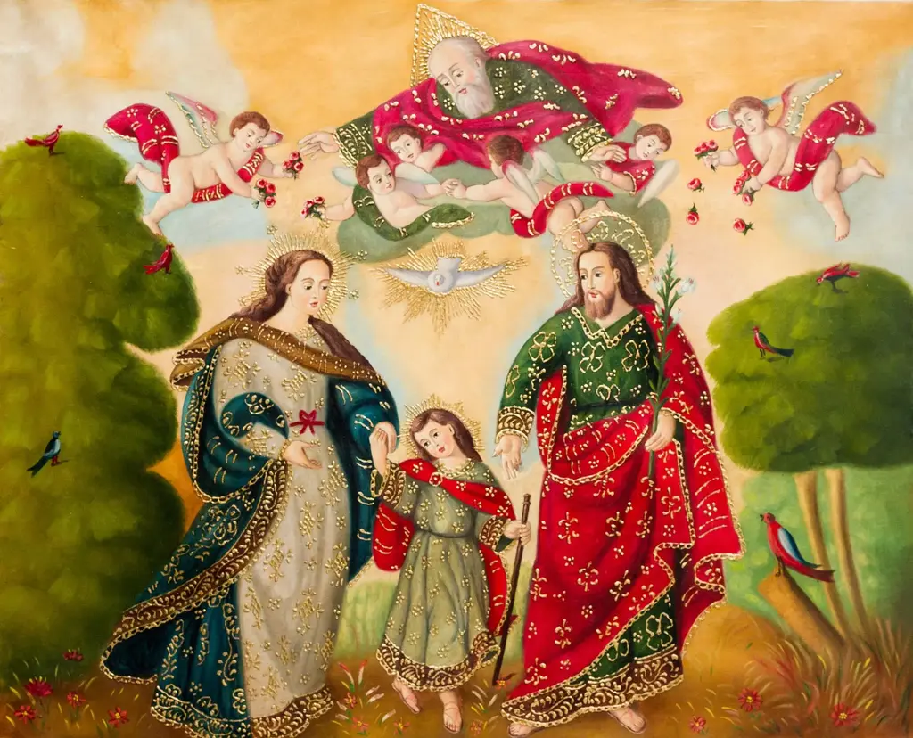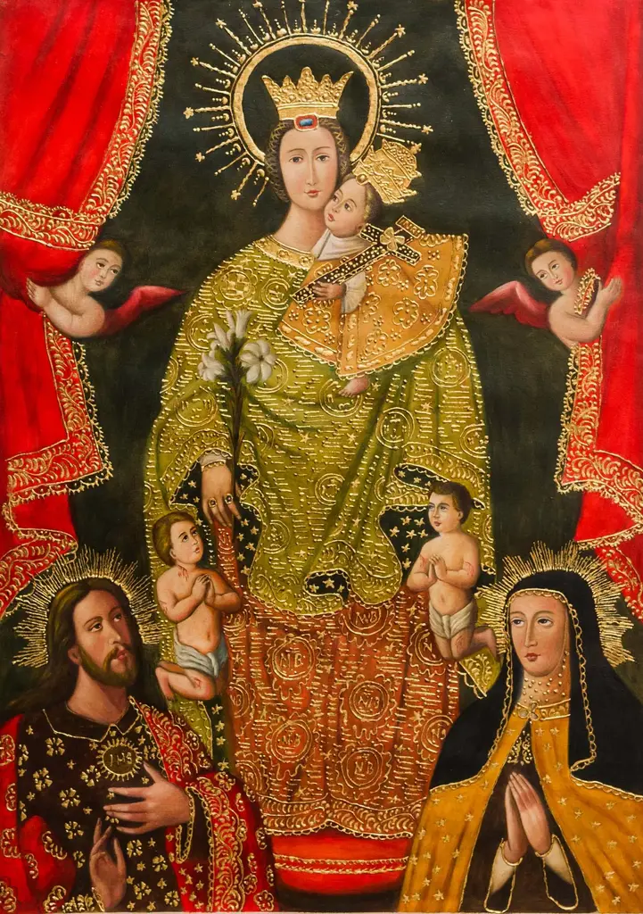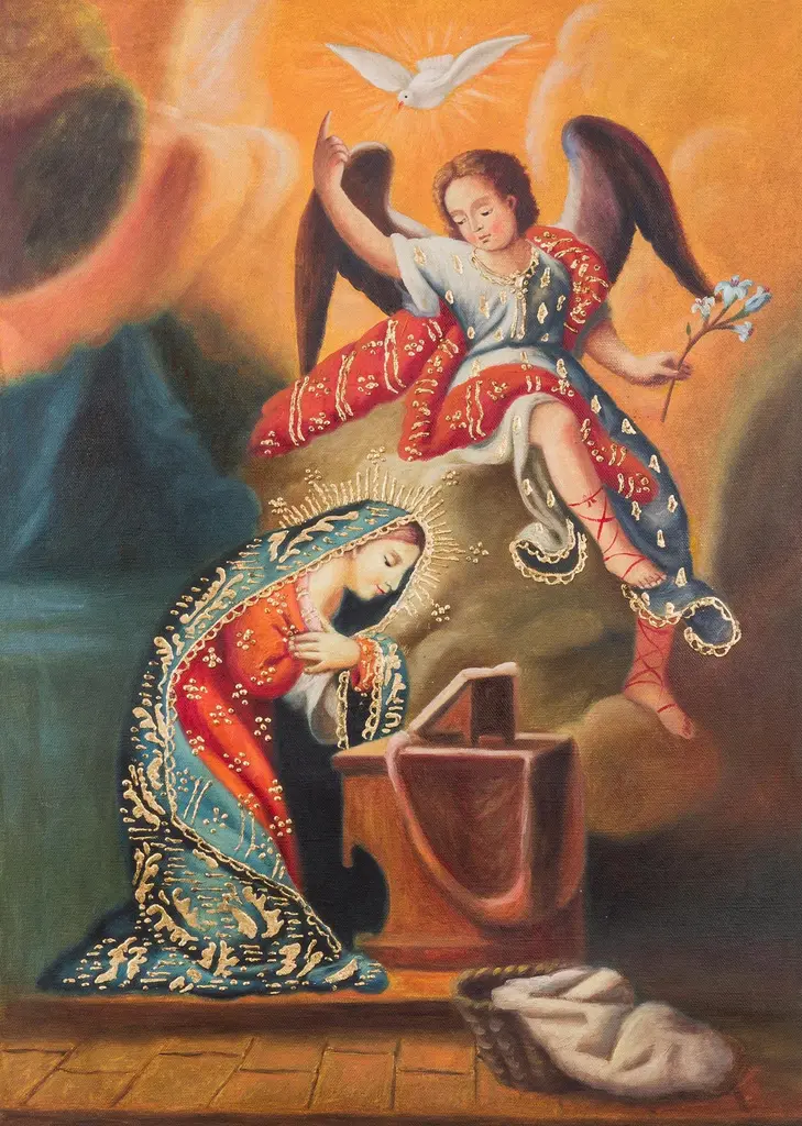 Wearing a crown of roses, Mary appears in a cloak of golden stars accompanied by three cherubs in this painting by Fernando Sayan Polo. He is inspired by the famed Cuzco School of religious portraiture as he replicates this stunning composition. According to the teachings of the Catholic Church, the term Immaculate Conception refers to Mary's conception being "conceived without original sin or its stain." Sayan Polo paints with oils and details his composition with bronze leaf, expertly replicating the religious art of Cuzco.Titled "Inmaculada concepción" in Spanish.