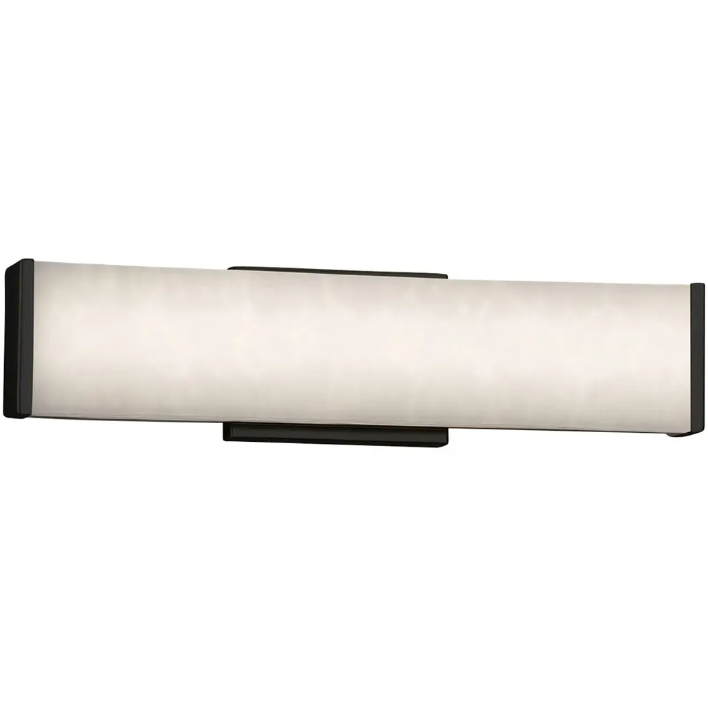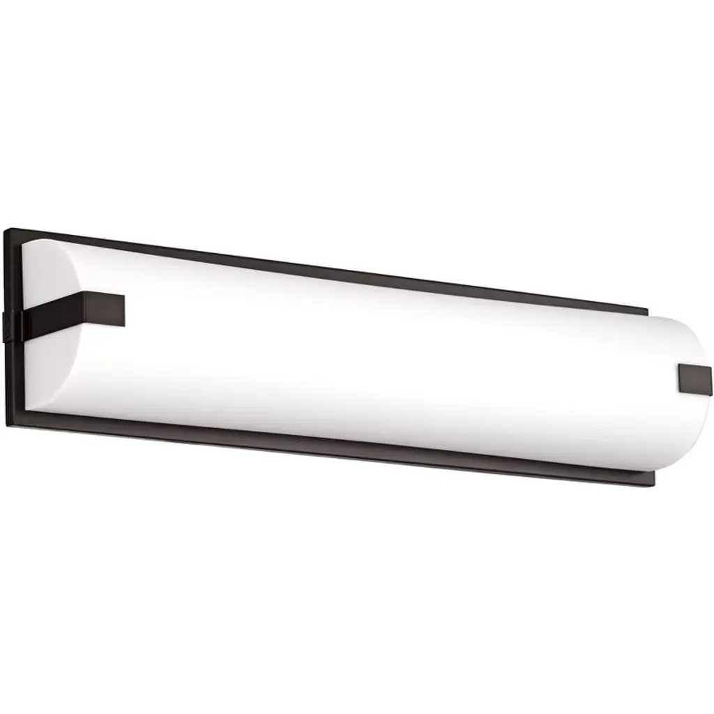 Bathroom lighting that makes a bold modern statement. The Impello LED Linear Vanity Light by Kichler has a smooth, rectangular body encased in a Satin Etched Cased Opal glass shade. Two pairs of metallic bars help accent the shade on either end. Inside is an integrated LED light source that is long-lasting and energy-efficient, providing a comfortable, warm illumination for many years to come. Can be installed either vertically or horizontally.
