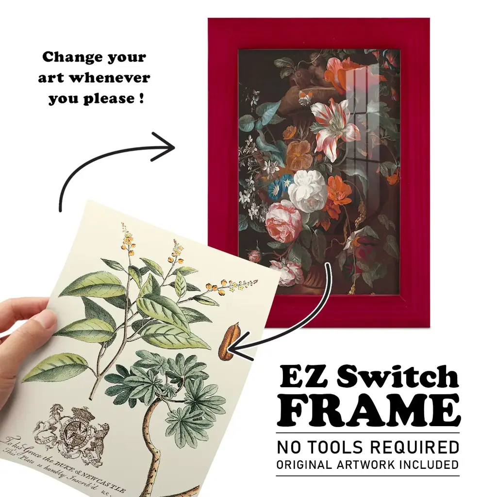 Imperial Foliage IV -EZ SWITCH Framed Print w/glass-Cherry Red A delightful, framed print. Featuring a solid wood frame with real wood glass. This premium print is giclee quality. In addition, every frame features a removable back and table top stand. This allows you to change your art in the future or to just stand the art on a table for a new look. We are sure you'll enjoy our new series of EZ SWITCH Framed Art. Solid Wood Frame Real Glass Removable / Replaceable Art Built in Tabletop Stand Sizes range from 4x6 up to 12x15 - buy just one or pair them up as sets as you see fit.