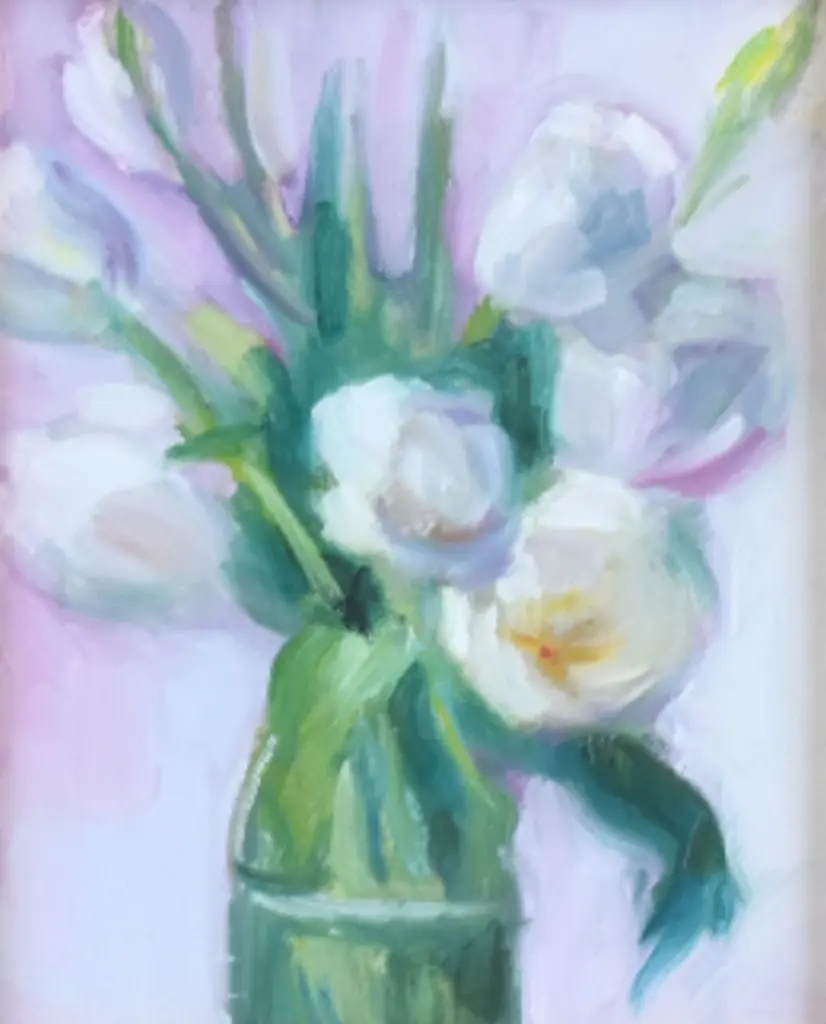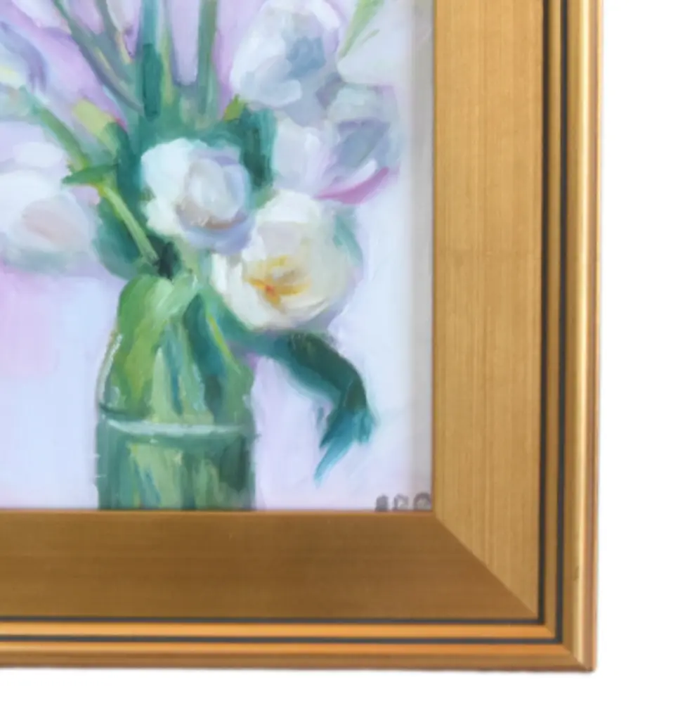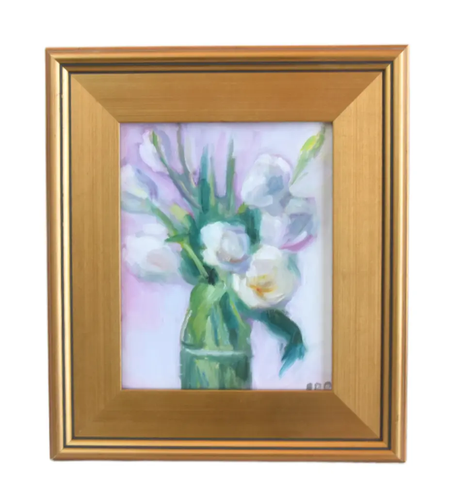 Contemporary original one-of-a-kind impressionist oil painting of a bouquet of flowers in a vase on the artist's canvas panel. Illegible signature/initials in the lower right corner. Included are the antiqued gold wood frame and hanging hardware/wire. Dimensions: Artwork, 8"L x 10"H; overall, including the frame, 13"L x 15"H. Offered by Mike Seratt of The Prized Pig. Excellent, beautiful condition!!!!