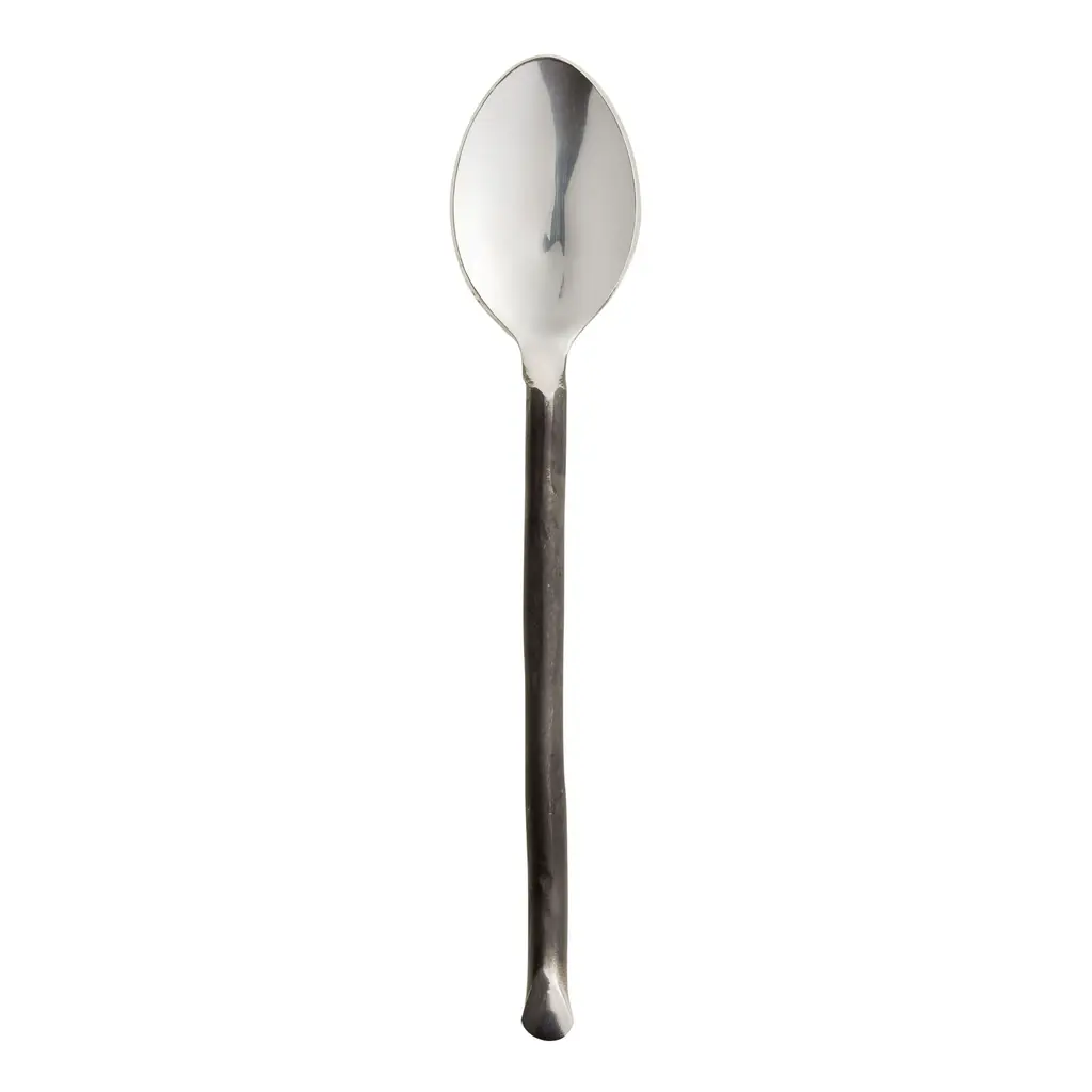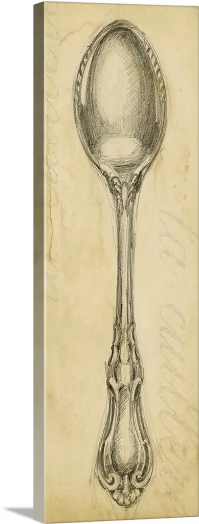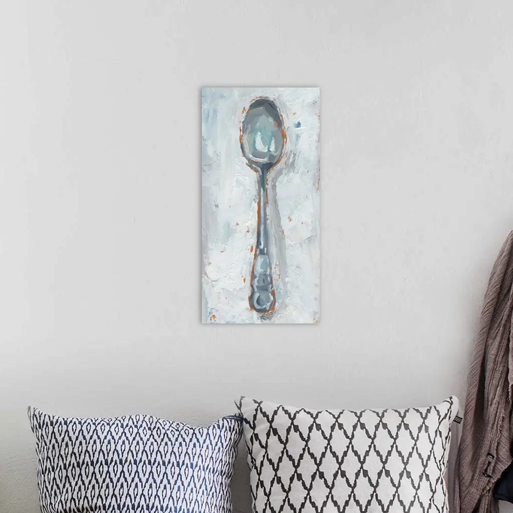 Rustic painting of a spoon made in cool tones with warm hints of orange popping out from underneath the layered paint.