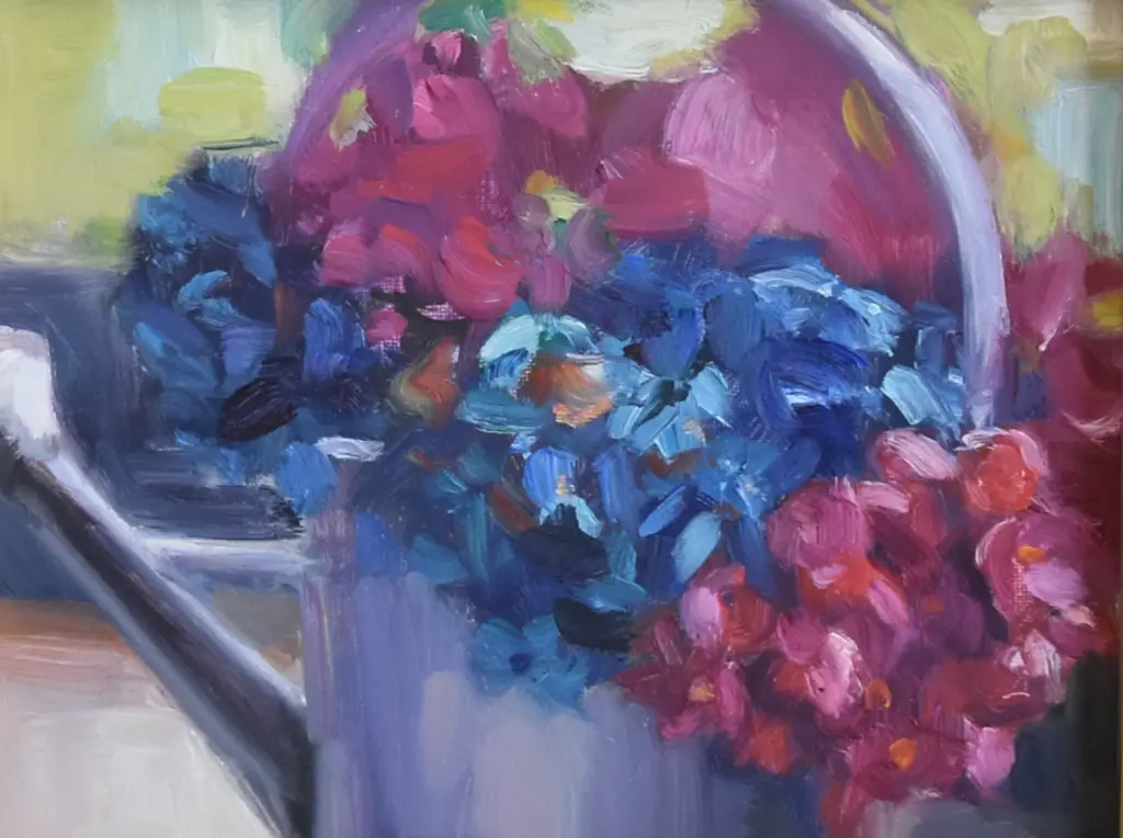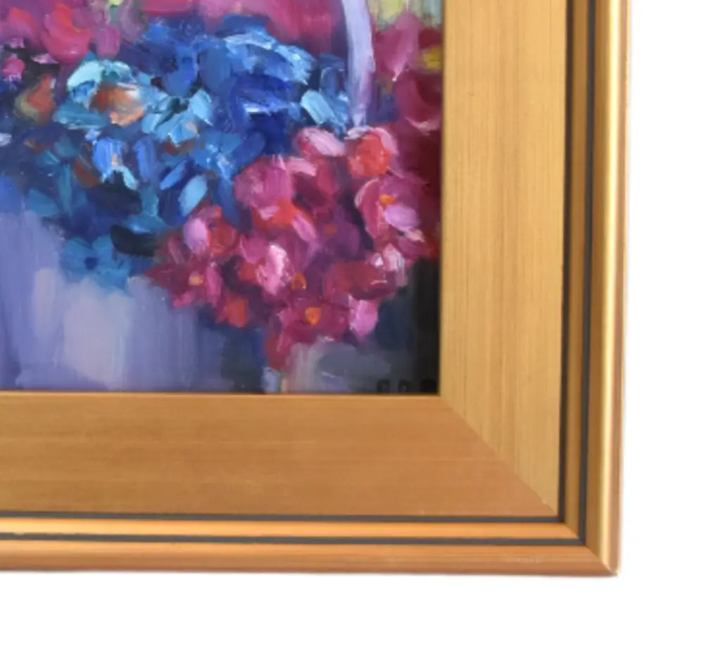 Contemporary original one-of-a-kind impressionist oil painting of a bouquet of flowers in a vase on the artist's canvas panel. Illegible signature/initials in the lower right corner. Included are the antiqued gold wood frame and hanging hardware/wire. Dimensions: Artwork, 10"L x 8"H; overall, including the frame, 15"L x 13"H. Offered by Mike Seratt of The Prized Pig. Excellent, beautiful condition!!!!