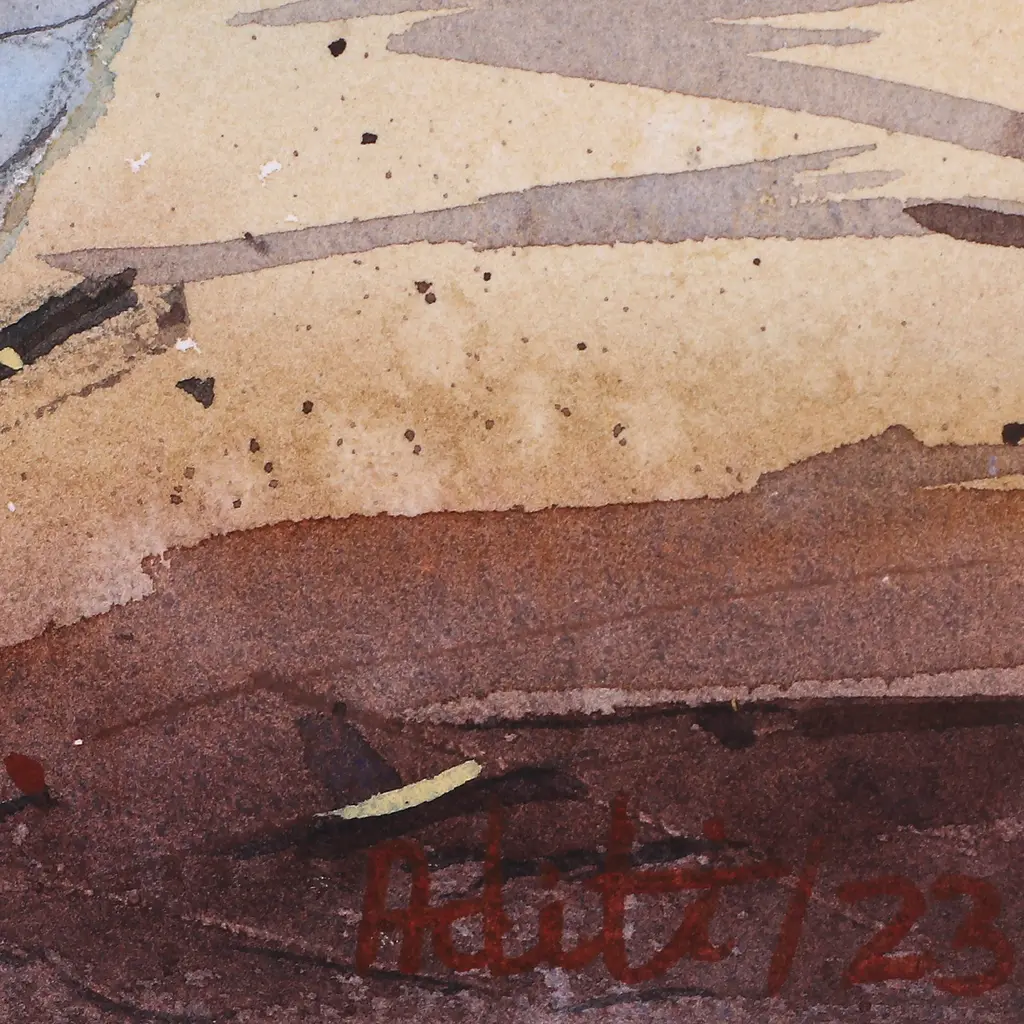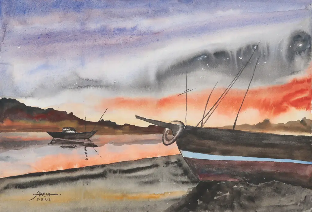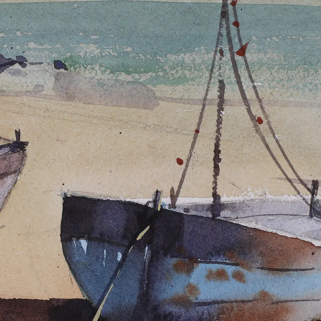 In this awe-inspiring watercolor painting, Indian artist Aditi Mukhopadhyay depicts three boats gently resting on the sandy shore, their hulls weathered and textured, hinting at adventures and stories of the sea. The boats are moored with delicate ropes, casting soft shadows on the warm beach. Behind them, calm waves stretch into a tranquil turquoise sea under a serene blue sky. On the left, a rustic wooden shack with slanted roofs adds a sense of place—possibly a fisherman's shelter. The horizon line is subtle and low, making the sky feel expansive. A few birds fly freely in the distance, adding movement to the otherwise still scene. This serene seascape artwork is rendered on handmade paper in an impressionist style.