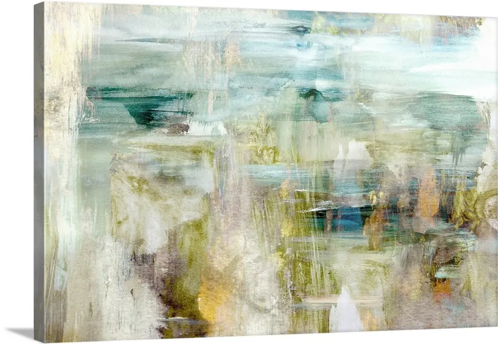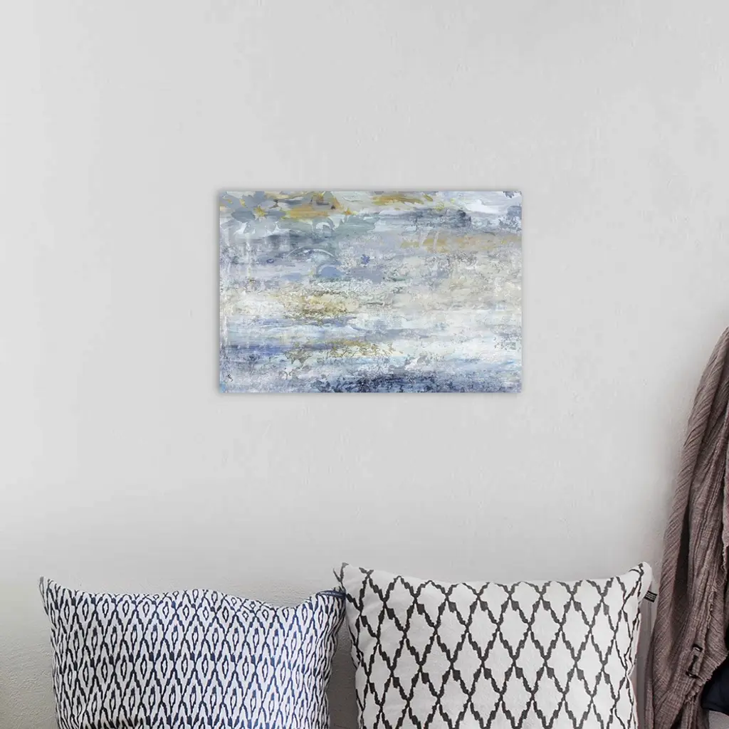 Contemporary abstract painting with shades of blue, gold, and gray creating a rough texture and a band of faint silhouetted floral print running across the top.