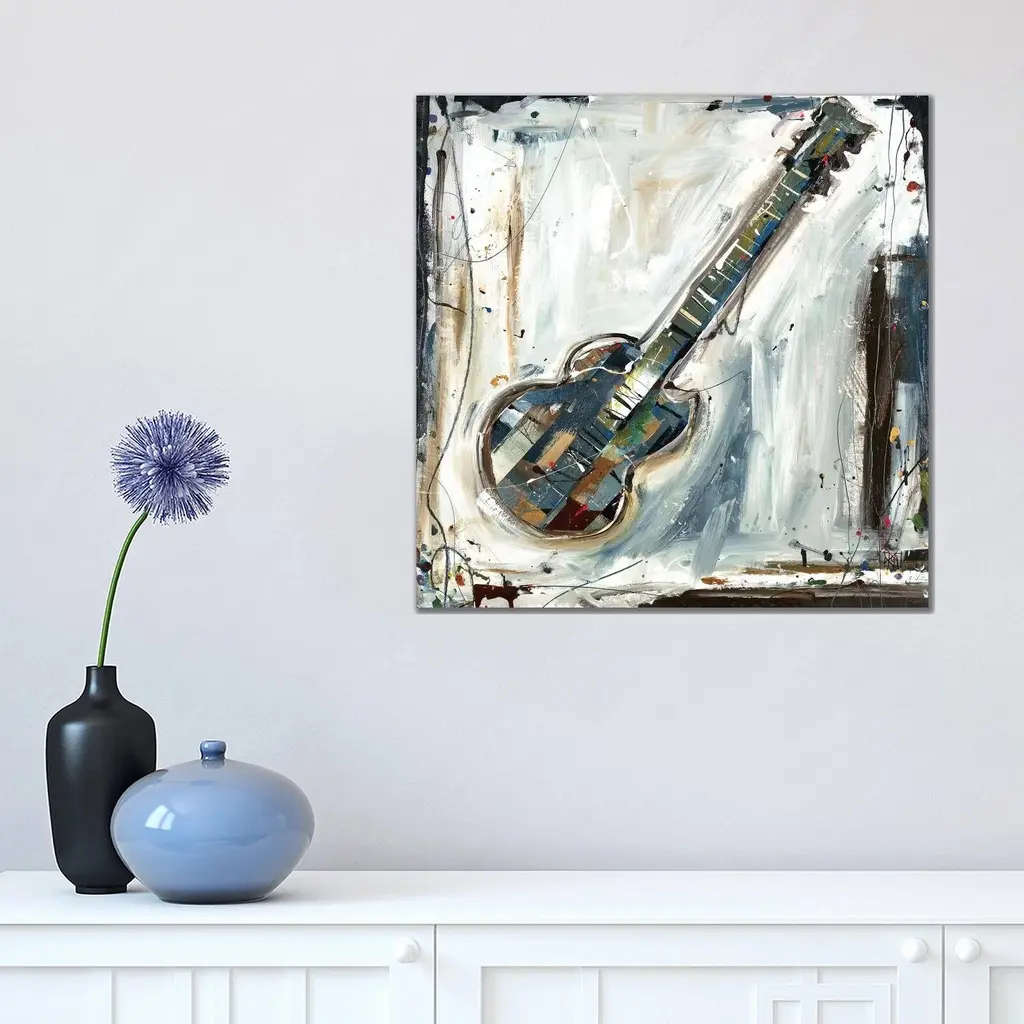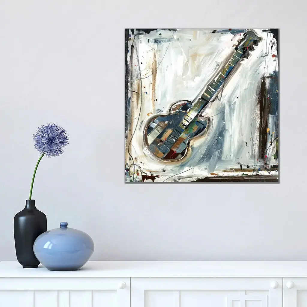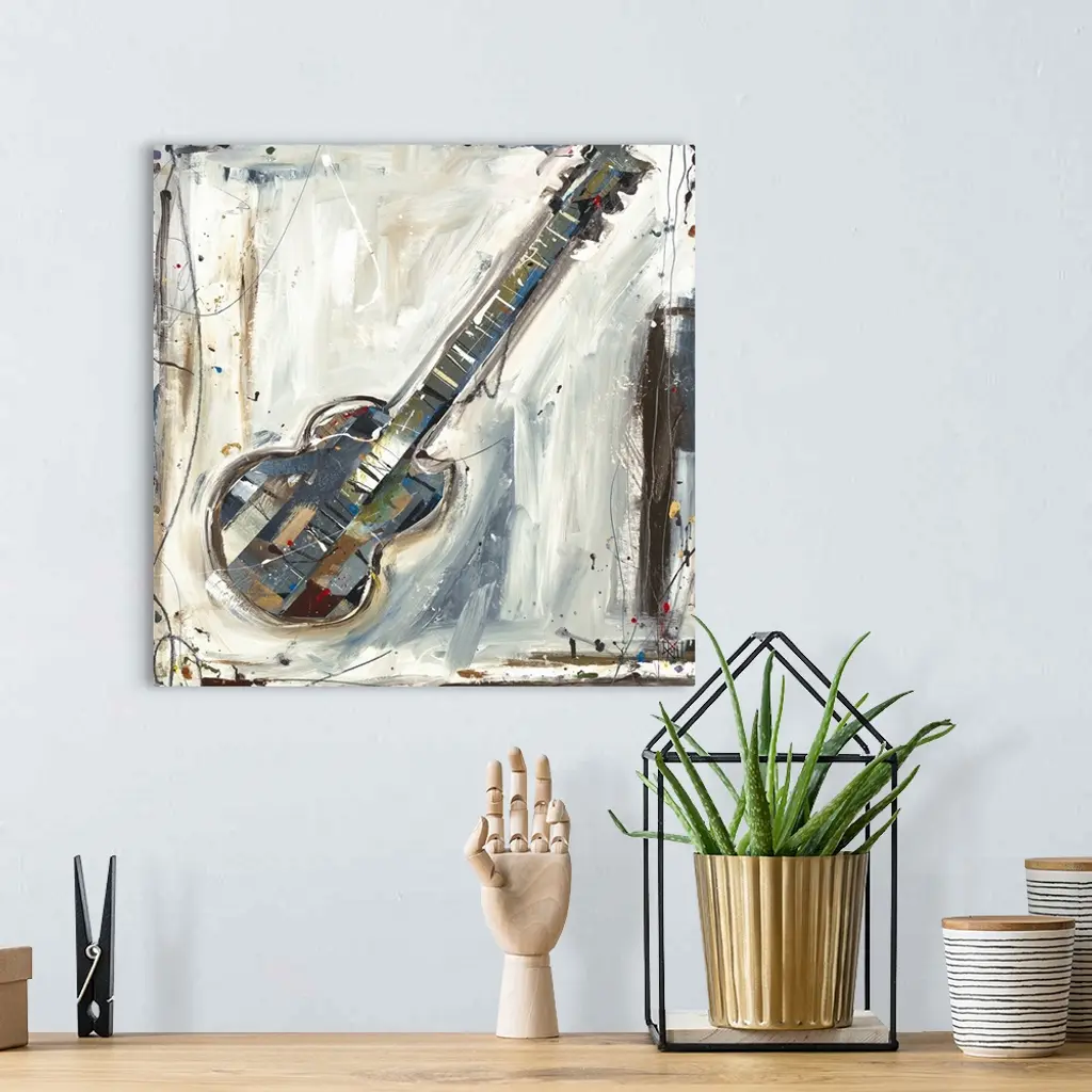 Contemporary abstract painting of musical instrument. Brush strokes are visible along with paint splatter and drips.