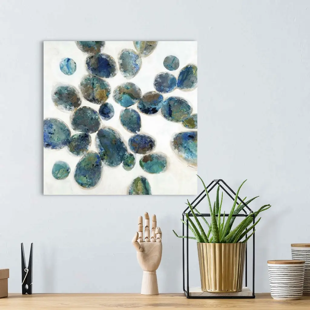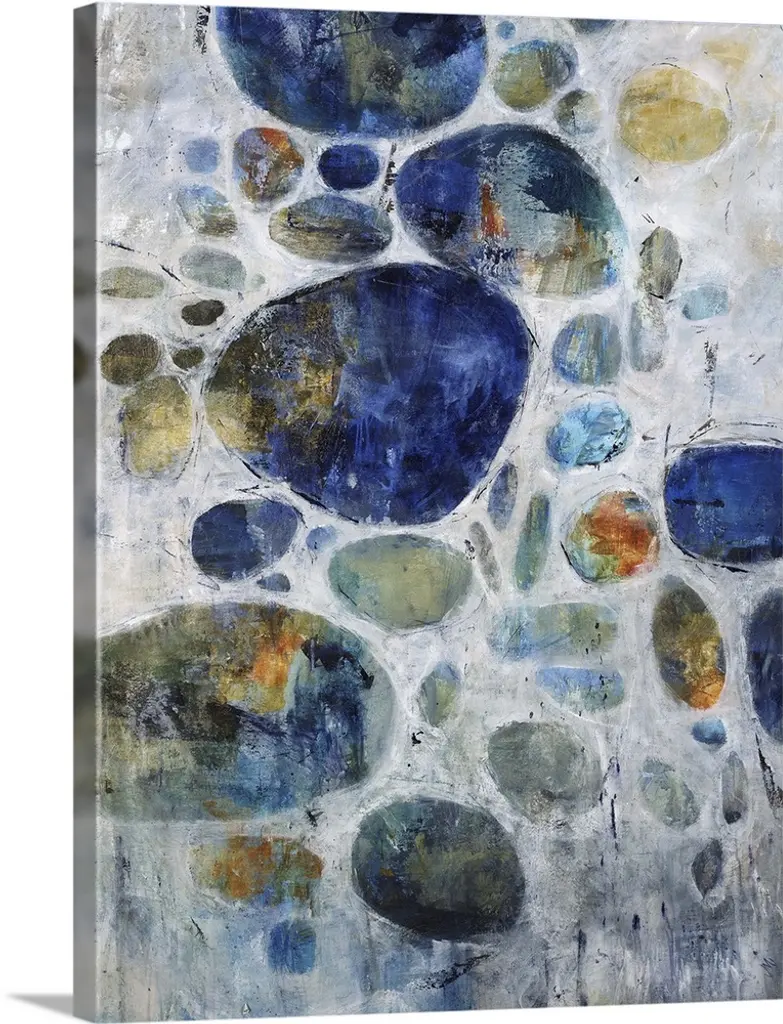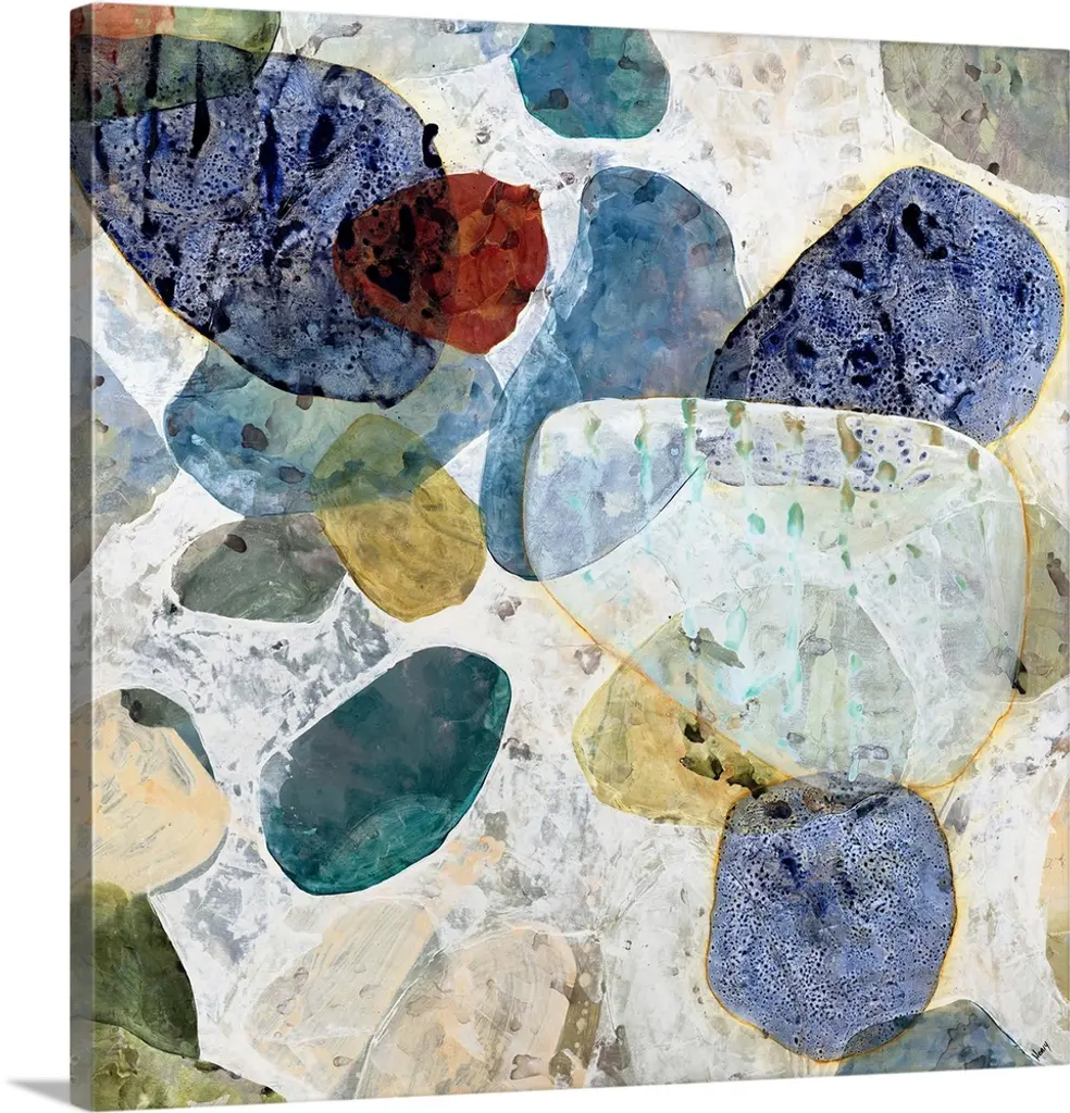 Contemporary abstract painting of small organic shapes in vibrant colors against a white background.