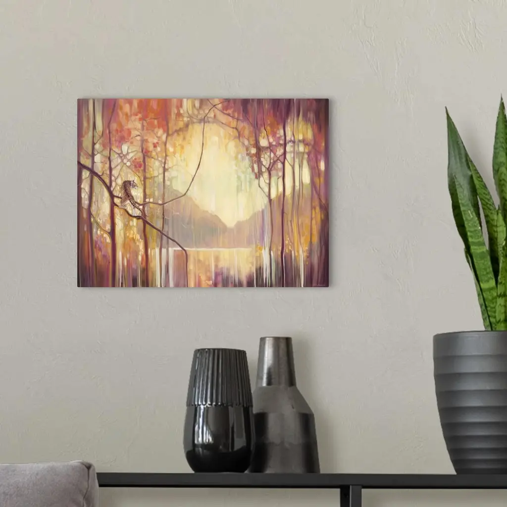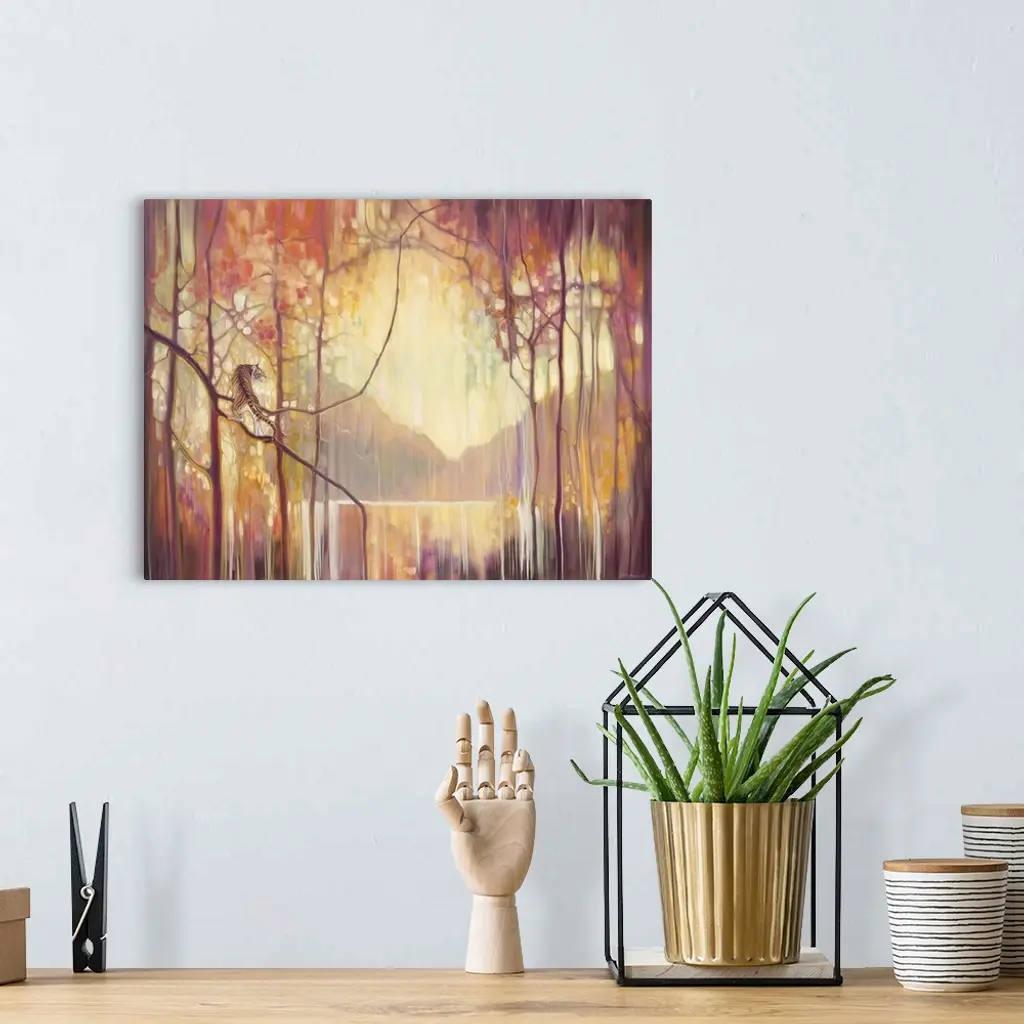 Watercolor painting of a dream-like forest framing a mountain scene.